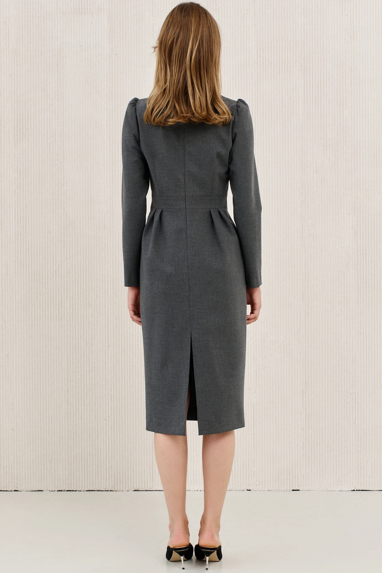 Платье женское приталенное длиной ниже линии колена, на нежной эластичной подкладке. Вырез V-образный. Отрезное по линии талии. По переду ниже линии груди подрез с возвышение по центру, от горловины до подреза средний шов, на уровне вытачек от подреза вверх и вниз заложены по две односторонние складки. По плечевому срезу переда -сборка. Спинка со средним швом, талиевыми вытачками выше линии подреза и двумя складками ниже линии подреза. В среднем шве спинки застежка на потойную тесьму-молнию и разрез. Рукав одношевный, втачной со сборкой по окату. Это платье будем чудесным решением для торжественного мероприятия или будет радовать Вас своим удобством в повседневной носке.