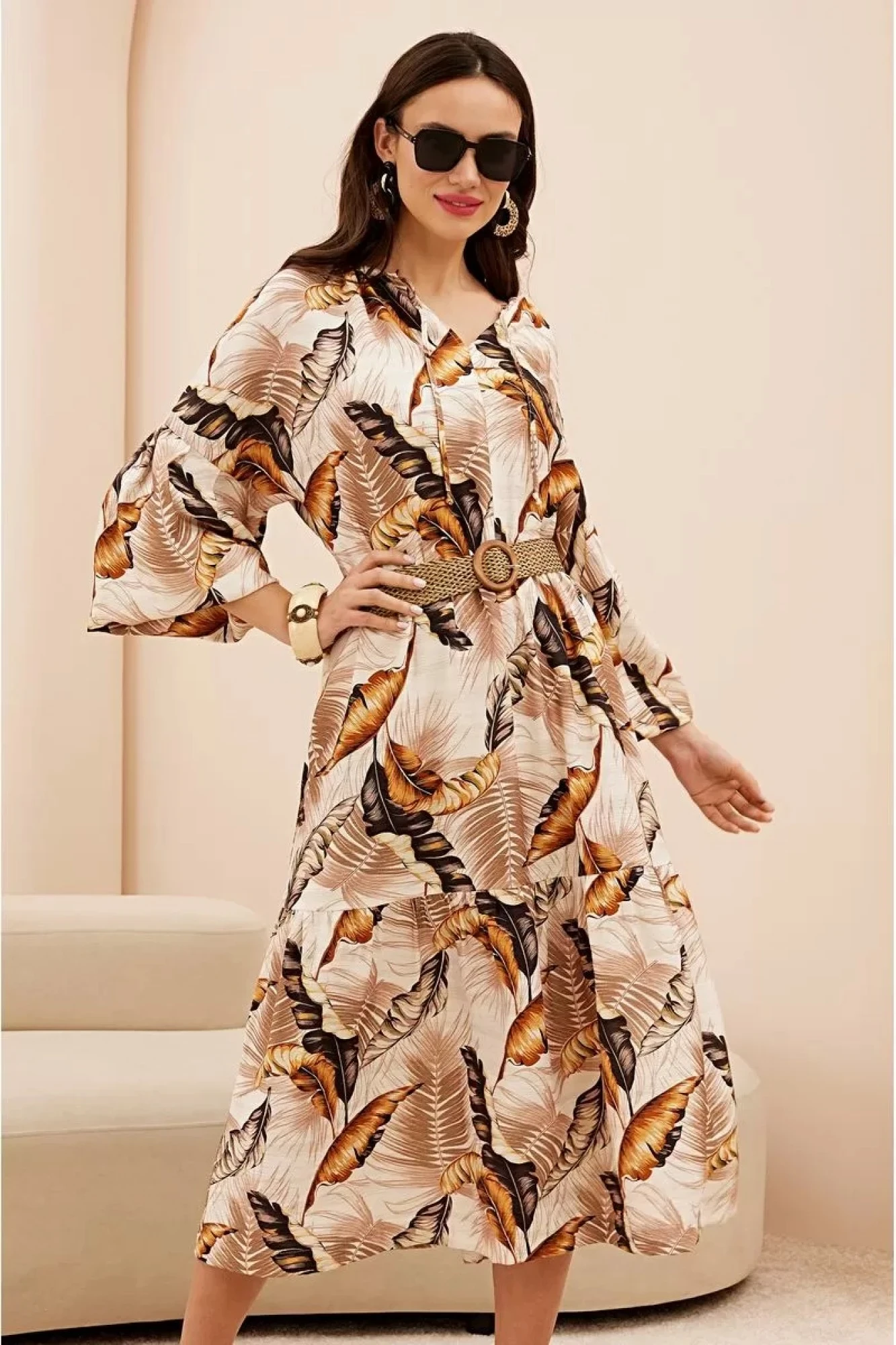 Эффектное платье в стиле «Бохо» из очень приятной принтованной ткани дополнено готовым поясом , отлично подходит для шпилек и обуви на плоском ходу. Платье А образного силуэта с притачным воланом отрезное по линии талии (на резинке). Лиф со средним швом и округлым вырезом на завязках с фиксаторами, Рукав комбинированного покроя, линия плеча приспущена, нижняя часть со складками и резинкой по низу (можно регулировать длину рукава). Съемный пояс фабричного производства завершает весь образ.