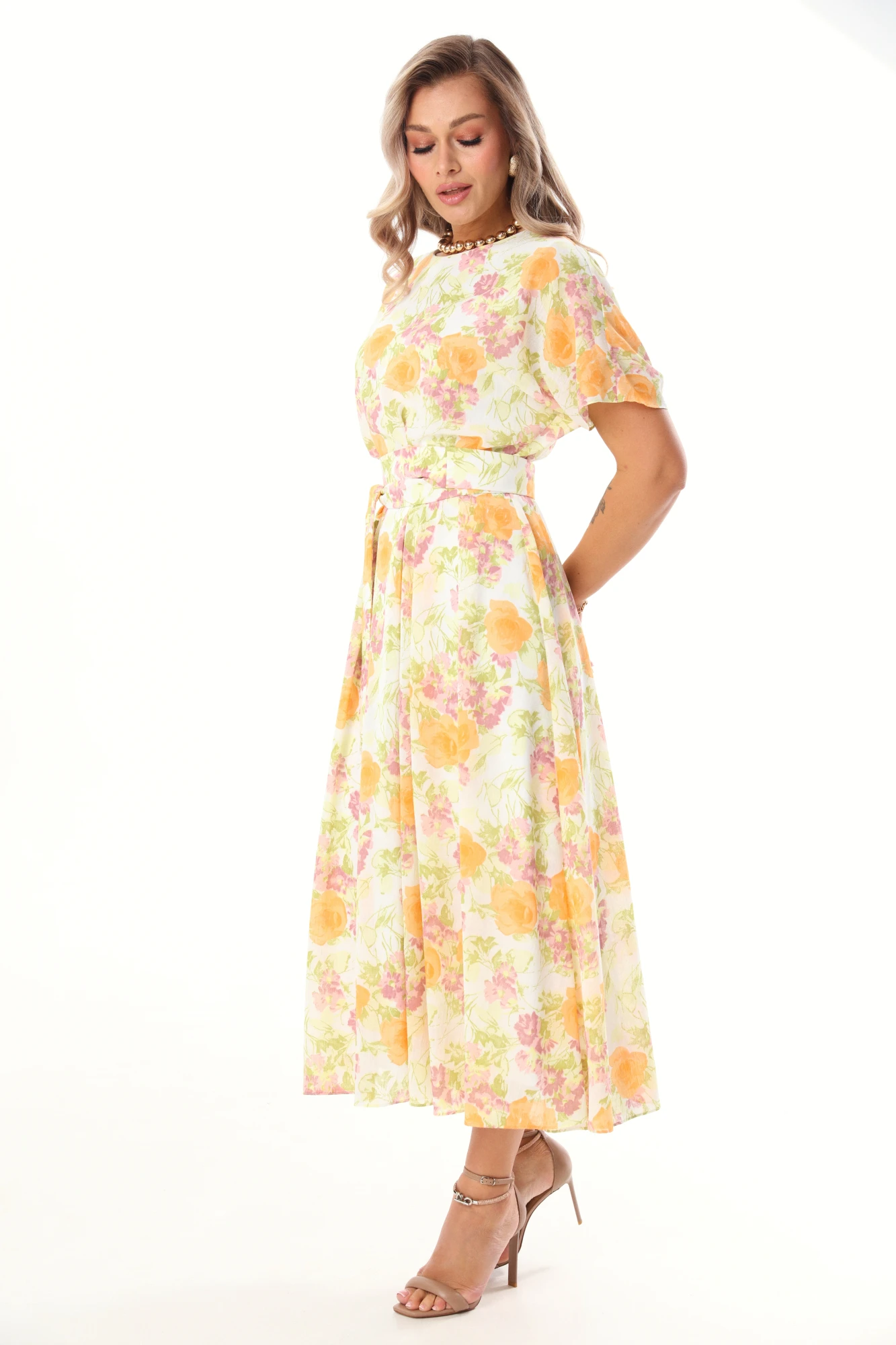 Платье из лёгкой ткани с ярким принтом. Застежка на потайную молнию по среднему шву спинки. В комплекте идет длинный съемный пояс. На юбке по линии талии заложены складки. Длина 128 см.