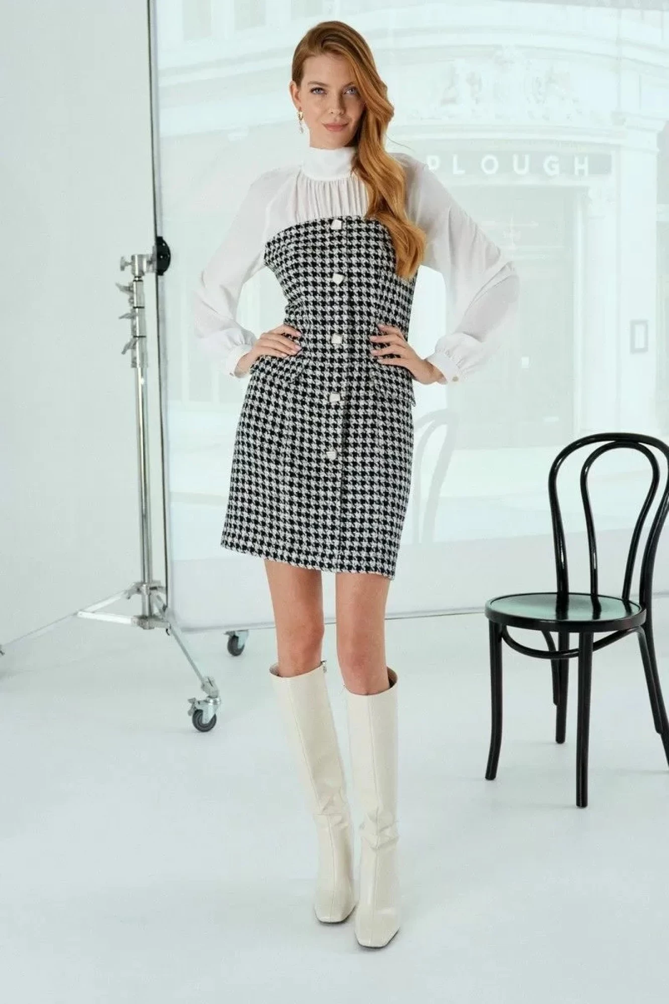 Платье женское, облегающего силуэта. Выполнено в форме корсета. По переду платья застежка с декоративными пуговицами. Верхняя часть платья выполнена из шифона, со сборкой до уровня груди, завязывается со спины на бант. Воротник-стойка. На уровне линии бедер выполнены карманы с клапанами. Рукав длинный, присборенный на манжету. Застежка- молния, расположена в среднем шве спинки.