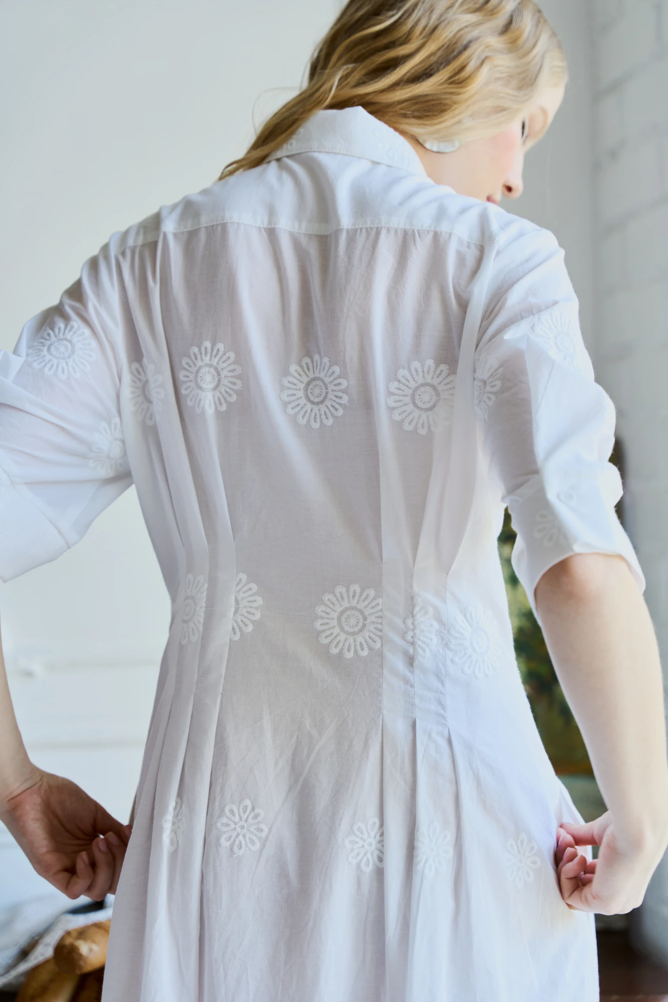 Платье полуприлегающего силуэта, выполнено из хлопковой ткани ришелье. Рукав втачной, короткий, по низу рукава манжета с застежкой на петли и пуговицы. Воротник рубашечного кроя, застежка на петли и пуговицы, в боковых швах карманы. По переду и спинке в области талии складки, по спинке кокетка.