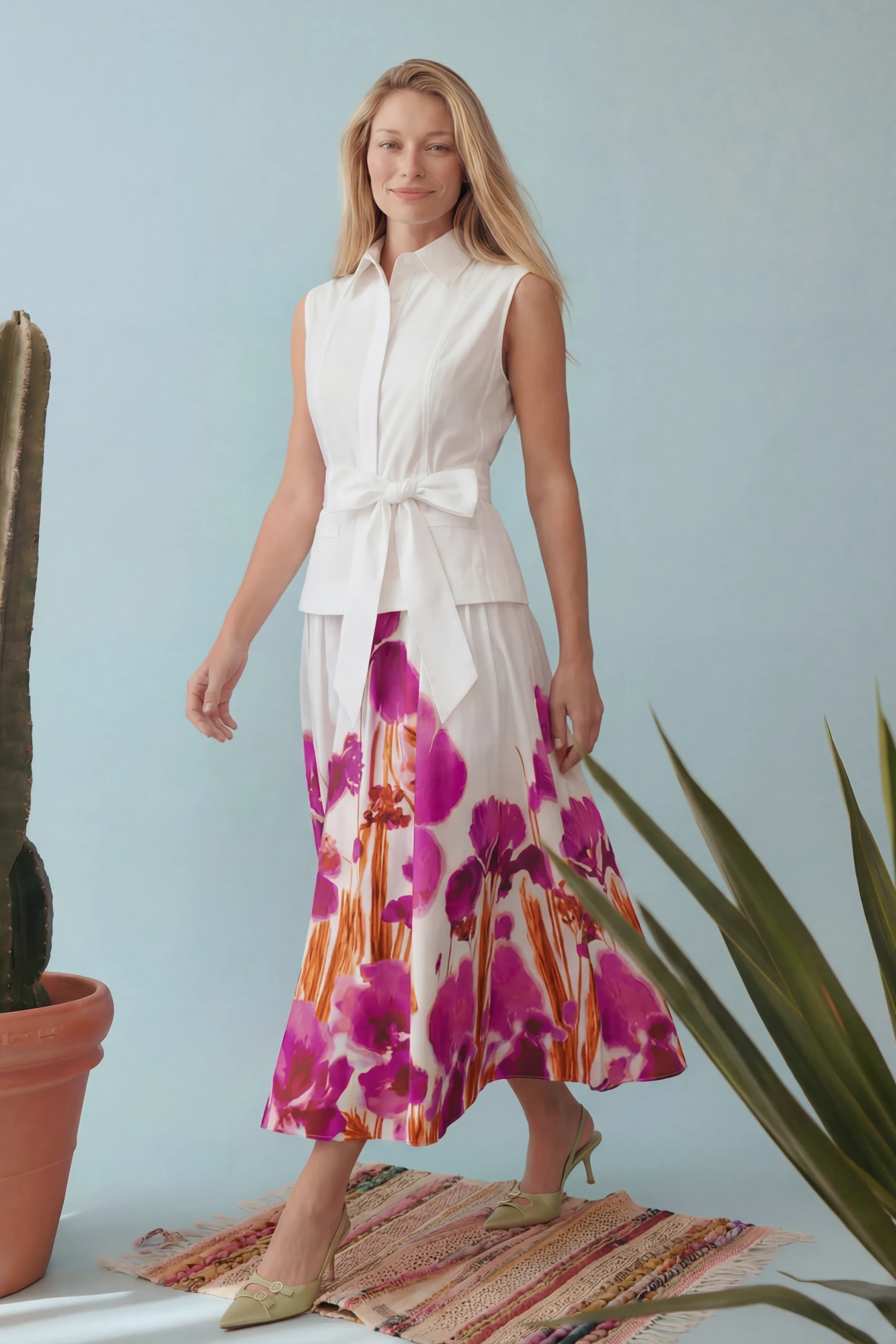 Платье с имитацией блузы и юбки выполнено из плотного хлопкового поплина с небольшим добавлением эластана для улучшения посадки. Блуза в платье до середины бедра, по переду рельефы выходят из проймы и уходят в линию низа блузы, по бокам не функциональные карманы-листочки. Линия плеча естественная, косая, без рукавов. Воротник стояче-отложной с острыми концами, рубашечного типа на отрезной стойке. Застежка центральная на петли и пуговицы. Юбка в платье со сборкой пришита к низу блузы платья. В боковых швах функциональные карманы. По спинке средний шов и вертикальные рельефы, по юбке купонный принт. Крупный флоральный рисунок расположен по нижней части изделия, плавно переходя в белый фон к линии талии. Главным декоративным элементом является художественный принт на юбке и широкий пояс из основной ткани, завязанный на пышный бант, эффектно подчеркивающий талию.