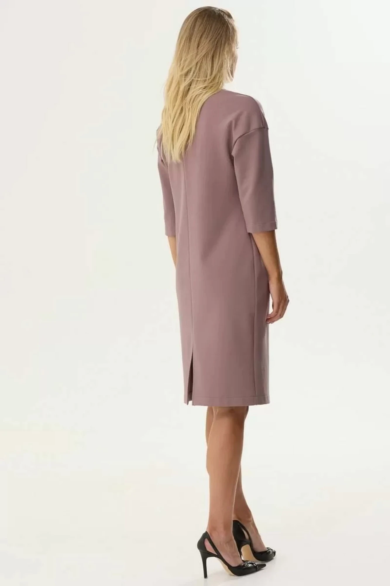 Стильное платье полуприлегающего силуэта из трикотажного полотна. Горловина округлой формы, на спинке застежка на потайную молнию. Рукав со спущенной линией плеча. По переду декоративные защипы. На спинке средний шов, по низу разрез.