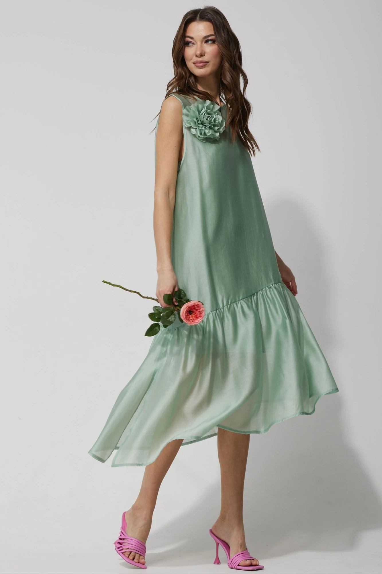 Ассиметричное платье А – силуэта из тенселя. Горловина округлая, на спинке застежка на петлю и пуговицу. По переду и спинке фигурный подрез со сборкой. Пройма углубленная. Нижнее платье полуприлегающего силуэта с нагрудными вытачками на бретелях из штапеля. В комплект сходит съемный декор.
