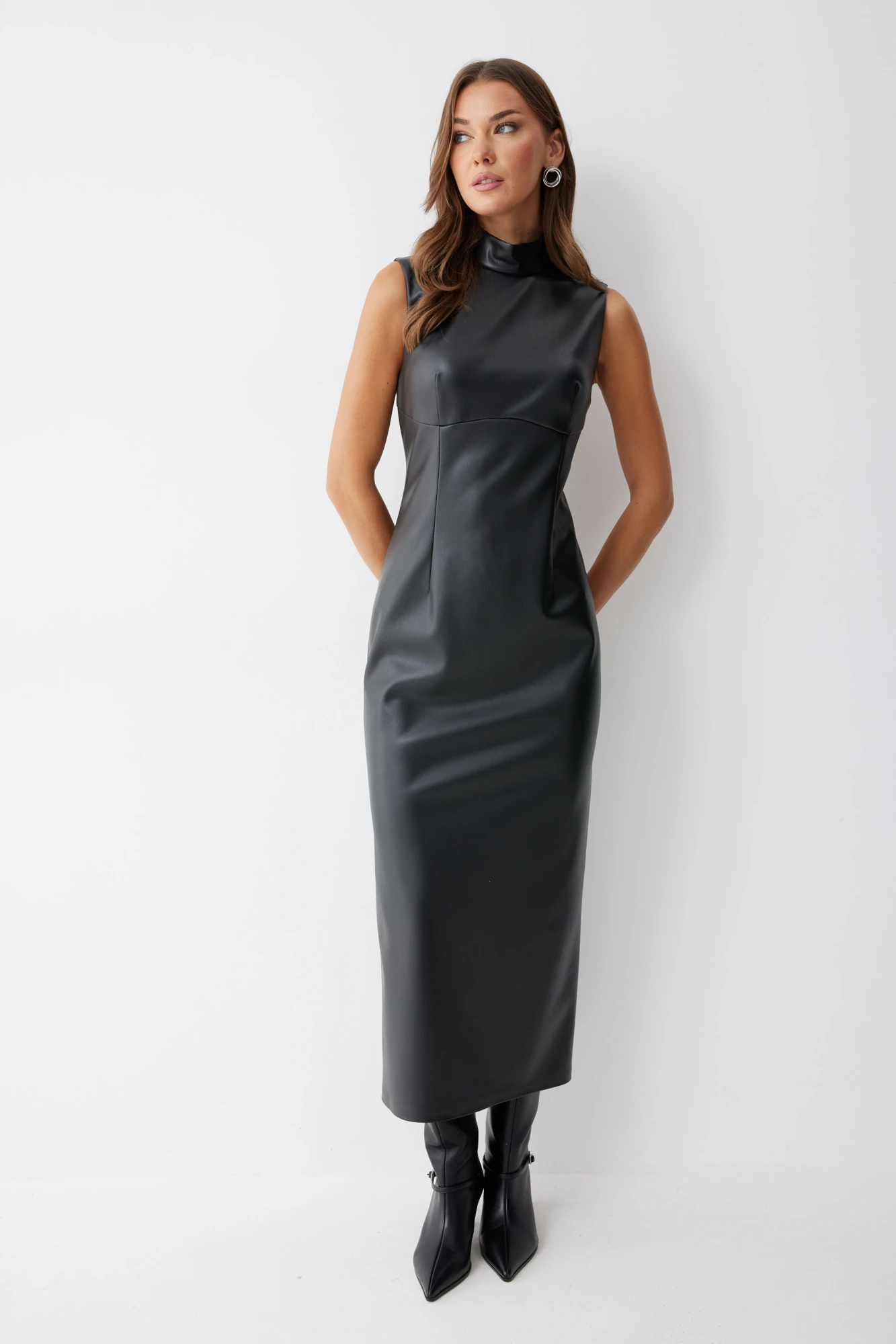 Платье прилегающего силуэта из экокожи длиной миди. Горловина-стойка. Спереди под грудью подрез, нагрудные и талиевые вытачки. На спинке в центральном шве потайная молния, по низу шлица. На спинке платья талиевые вытачки.