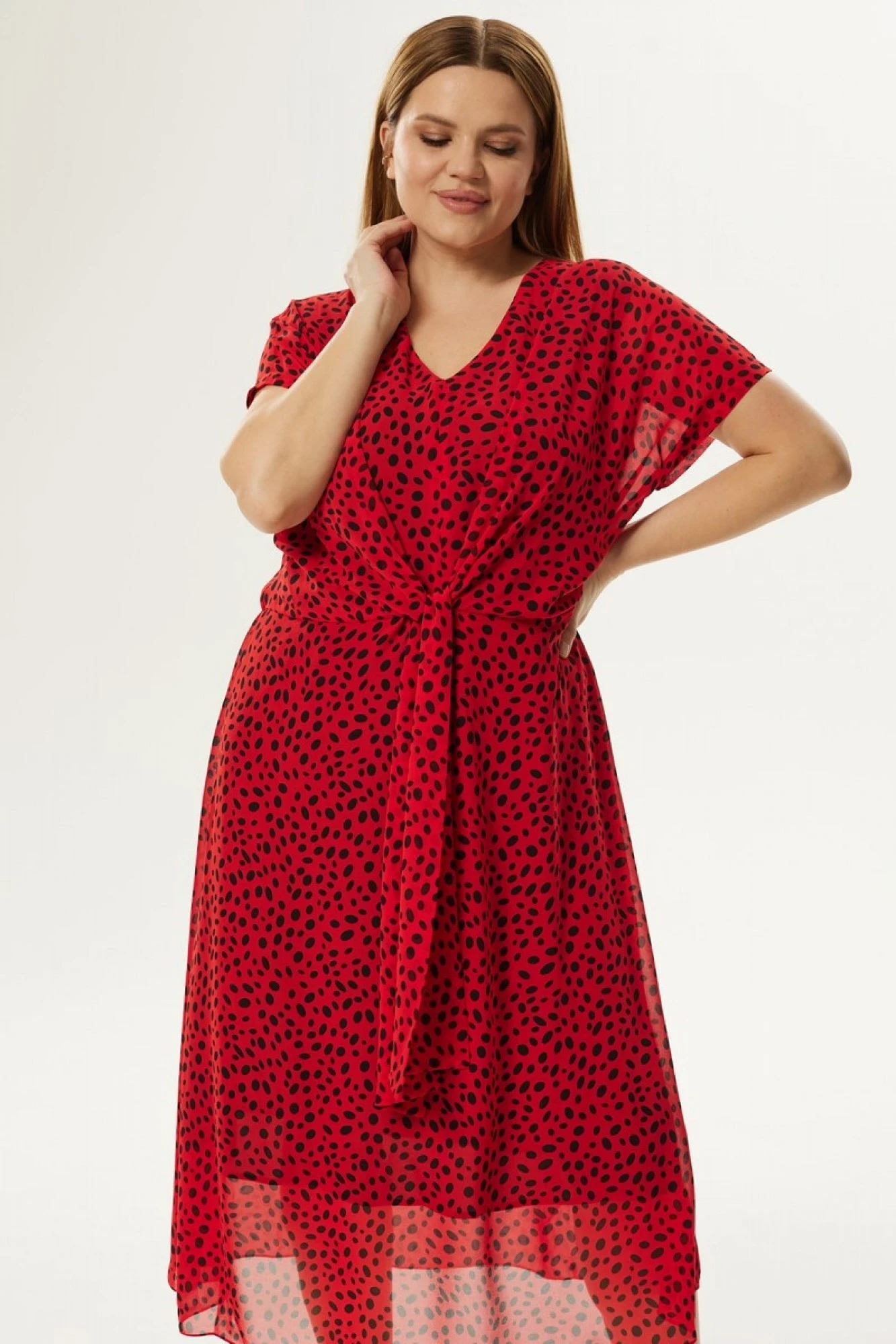 Яркое нарядное шифоновое платье свободного силуэта из струящейся ткани. Горловина V-образной формы. Платье со спущенным плечом, отрезное по линии талии. На полочке выполнен декоративный узел, на спинке по линии талии вставлена резинка.