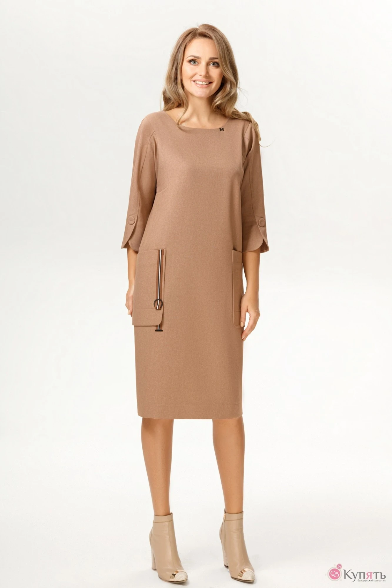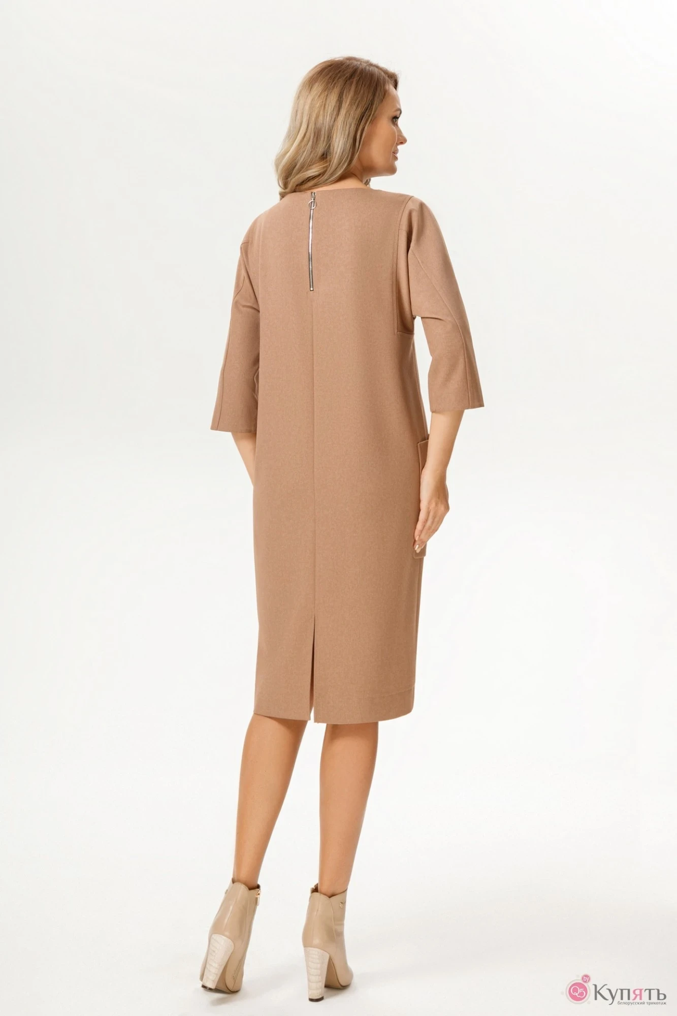 Стильное платье свободного кроя, без подкладки, с горловиной овальной формы. Рукав 3/4, спущен. По спинке в среднем шве застежка на металлическую молнию. Платье дополнено боковыми накладными карманами. Длина платья от плечевого шва 108 см. Длина рукава 49см.