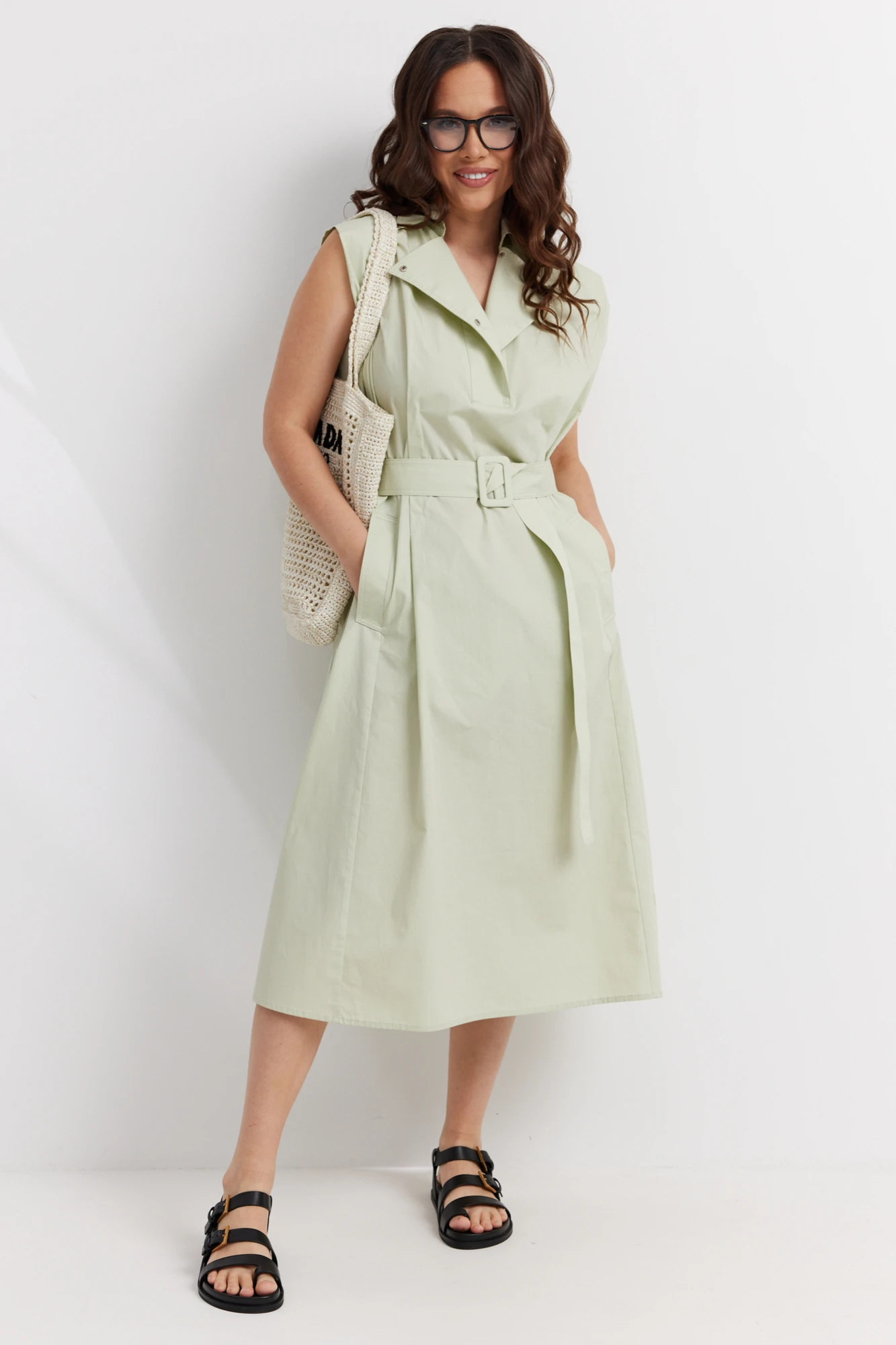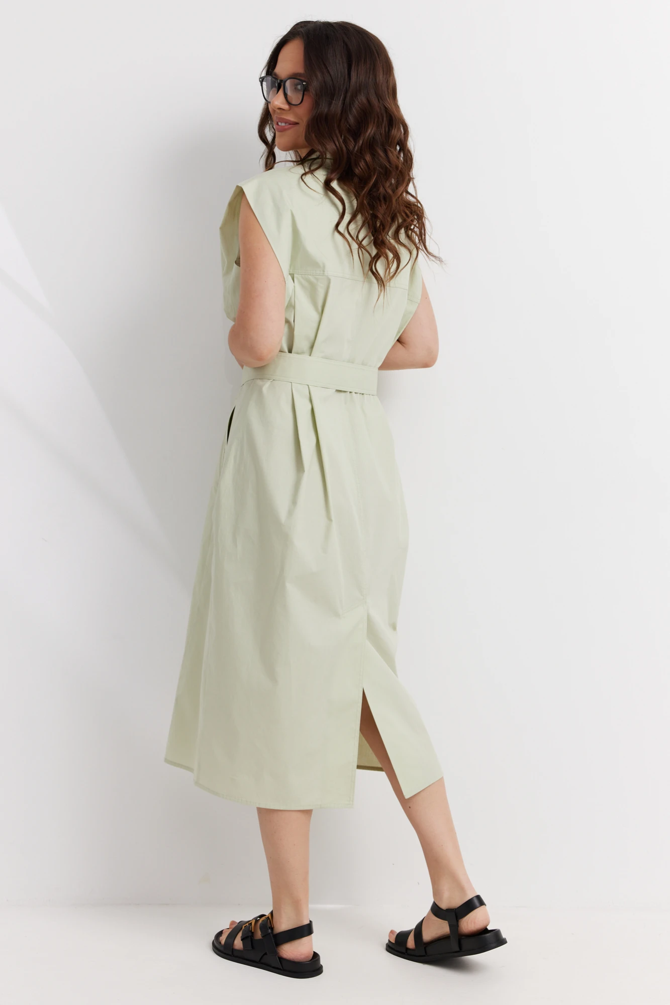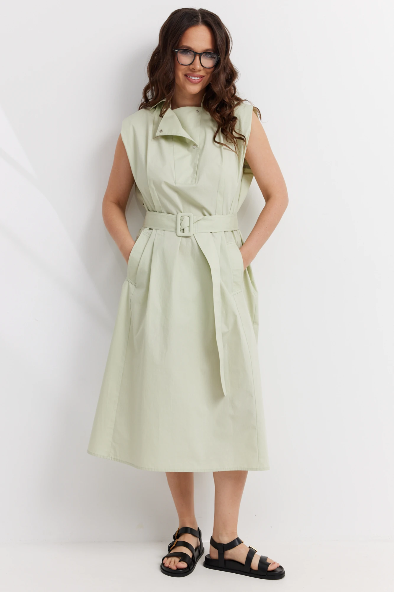 Стильное и комфортное платье из хлопковой ткани. Платье свободного силуэта с оригинальными декоративными защипами для придания формы и силуэта. Приталено за счет съемного пояса, выполненного из основной ткани. Горловина обработана отложным воротником. Воротник можно укладывать разными способами. Платье дополнено удобными карманами.