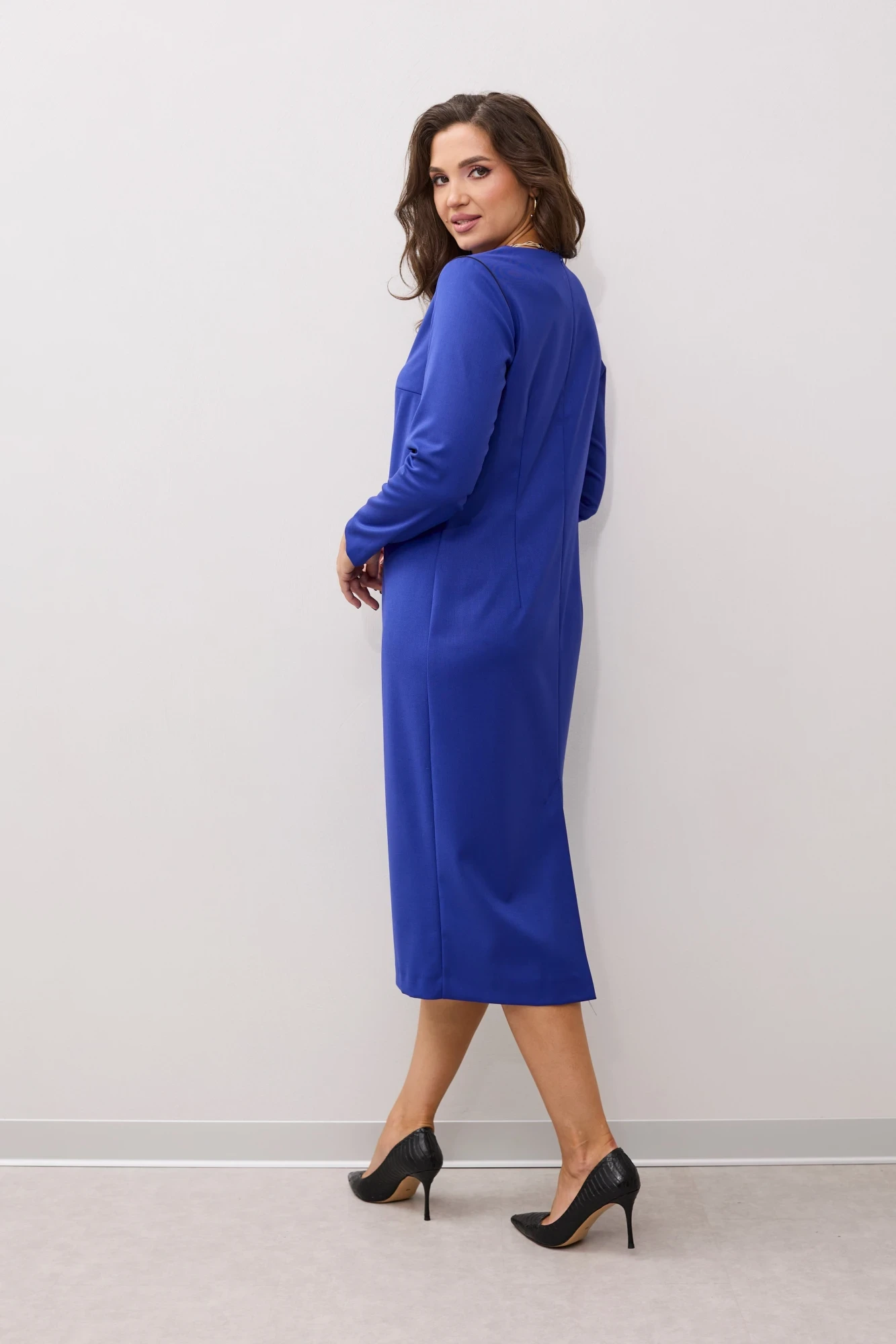 Платье полуприлегающего силуэта, зауженное книзу. По середине переда вставлен декоративный кант. По спинке средний шов с застежкой на молнию и шлицей. Рукав втачной, заужен книзу. По пройме вставлен декоративный кант. В комплекте пояс с отделкой кантом.