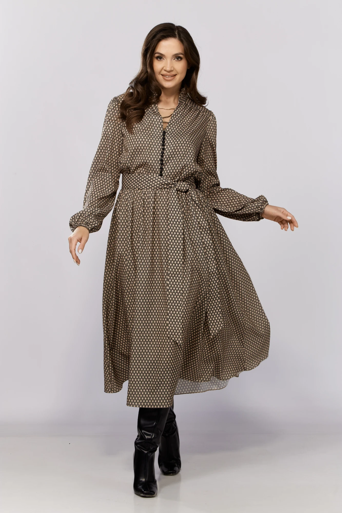 Платье из струящейся ткани , с подкладкой на юбке свободного силуэта, приталенное за счет резинки на поясе. Спереи декоративная застежка на воздушные петли и пуговицы. Воротник-стойка с рюшей. Рукав втачной, расширенный к низу, собран на резинку.