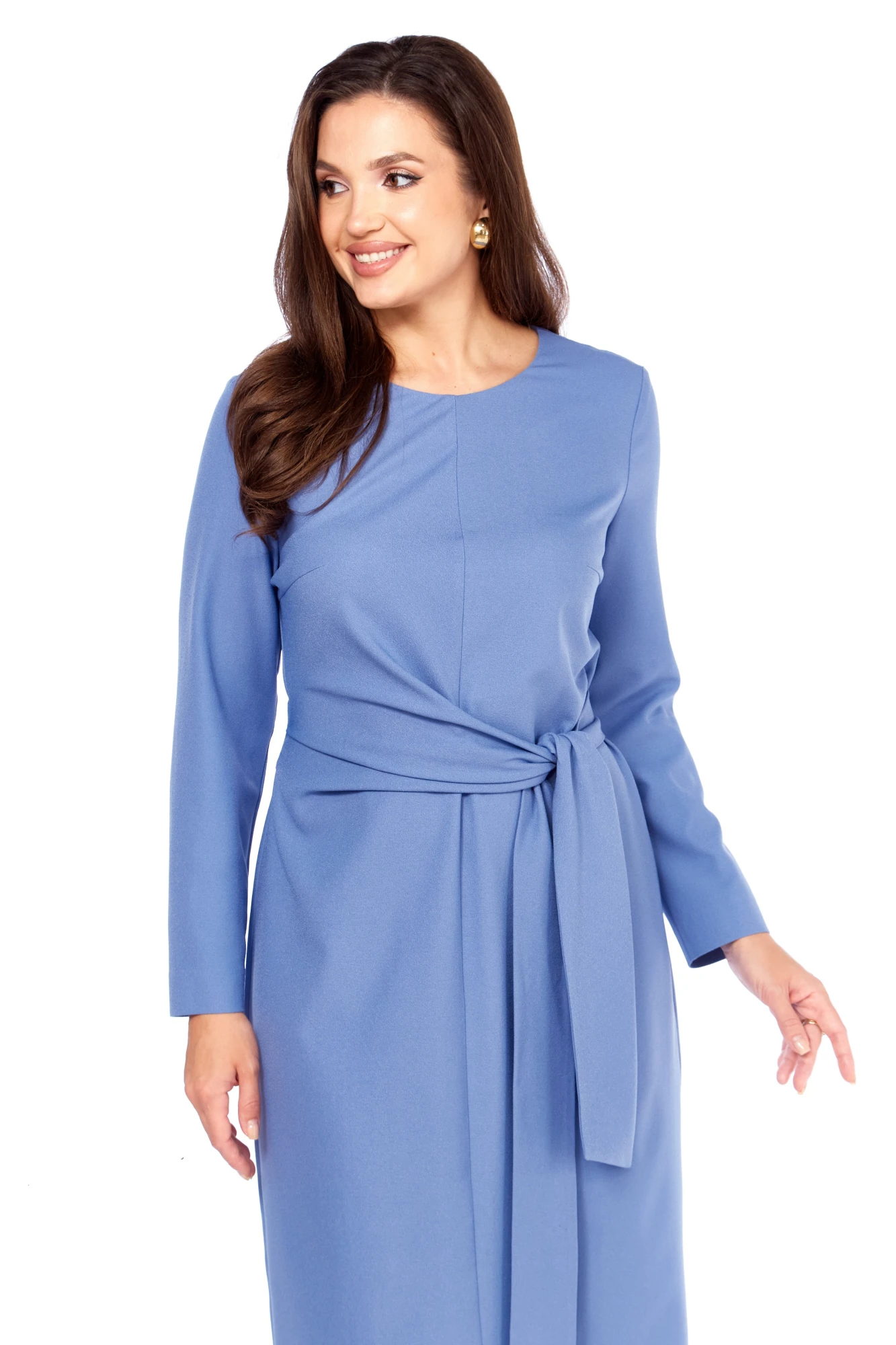 Платье полуприлегающего силуэта, слегка зауженное к низу. Спинка со средним швом и шлицей. Горловина округлой формы, по спинке с застёжкой на пуговицу и навесную петлю. Рукав длинный втачной. По переду средний шов, нагрудные вытачки, на уровне талии декоративные складки, переходящие в пояс