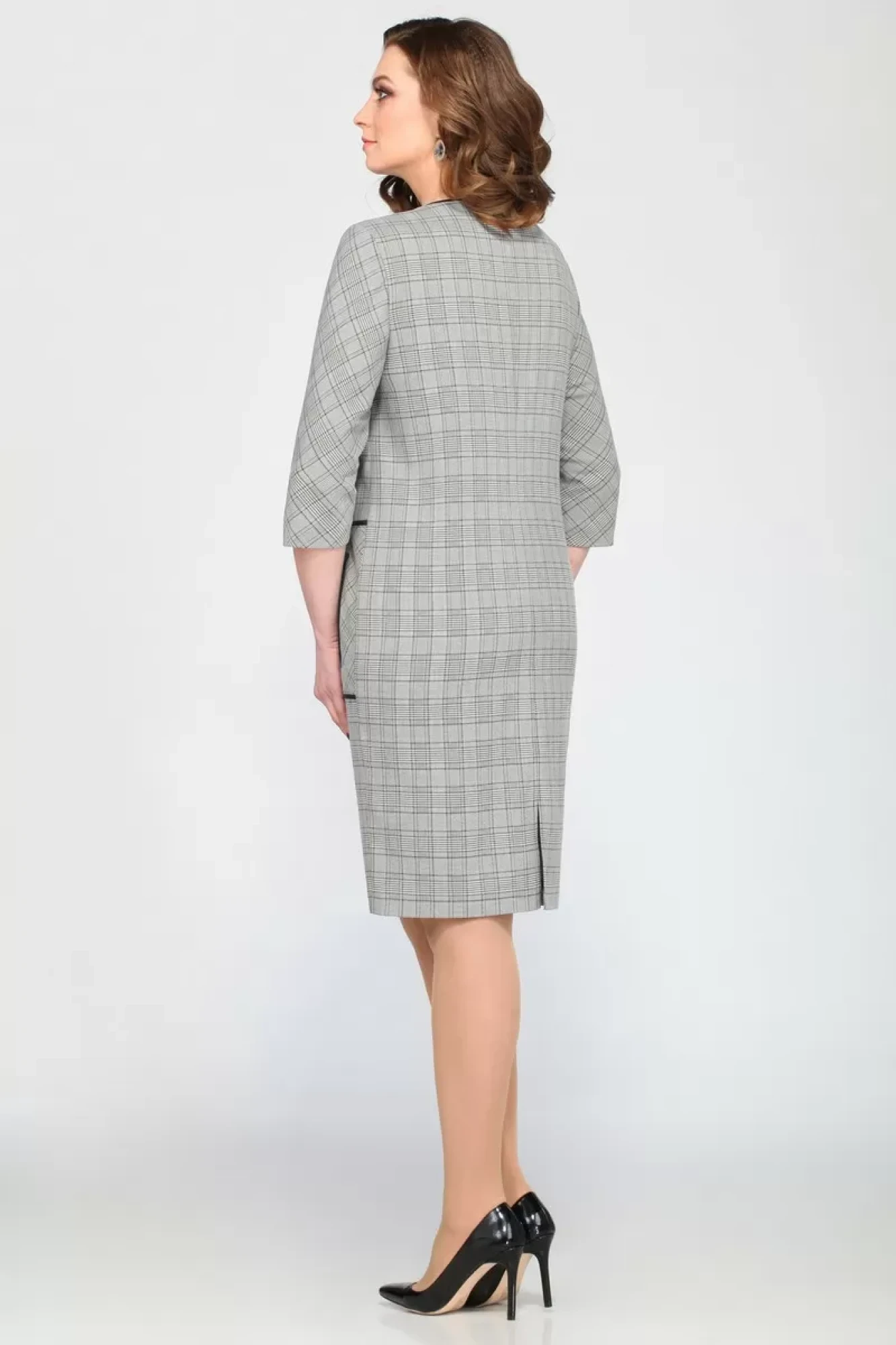 Платье женское полуприлегающего силуэта. Застежка центральная на молнию. Полочка с нагрудными вытачками от бокового шва и накладными карманами. Листочка, кант горловины и кант кармана из отделочной ткани "кожа". Рукав втачной, 3/4. Спинка со средним швом и разрезом.