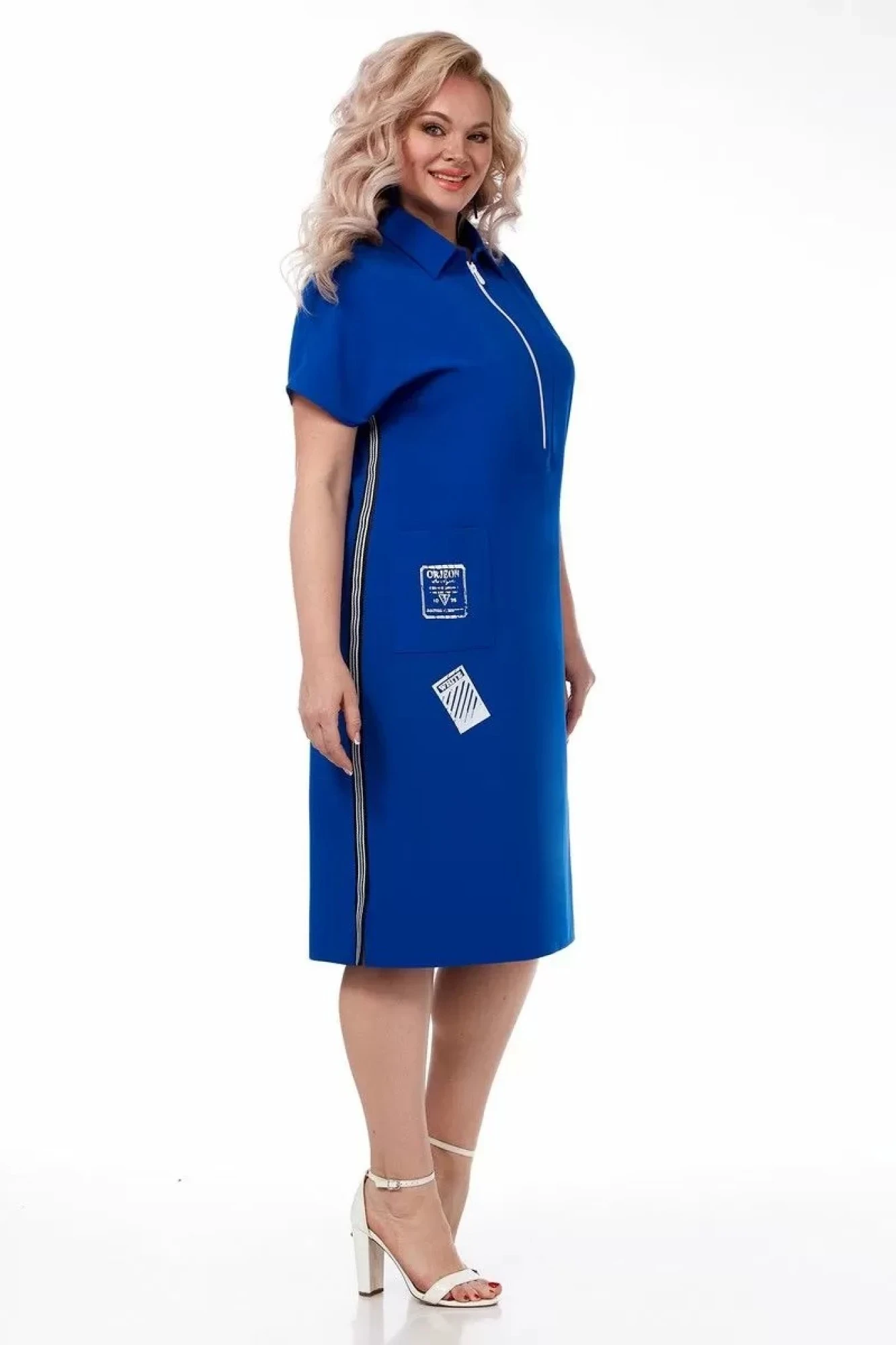 Платье женское, прямого силуэта, рукав цельнокроеный коротки. Застежка молния по центру переда до уровня груди. Воротник рубашечный с отрезной стойкой. По переду на уровне линии бедер 2 накладных кармана, с правого боку выполнена печать. В боковых швах разрезы и настрочена декоративная тесьма.