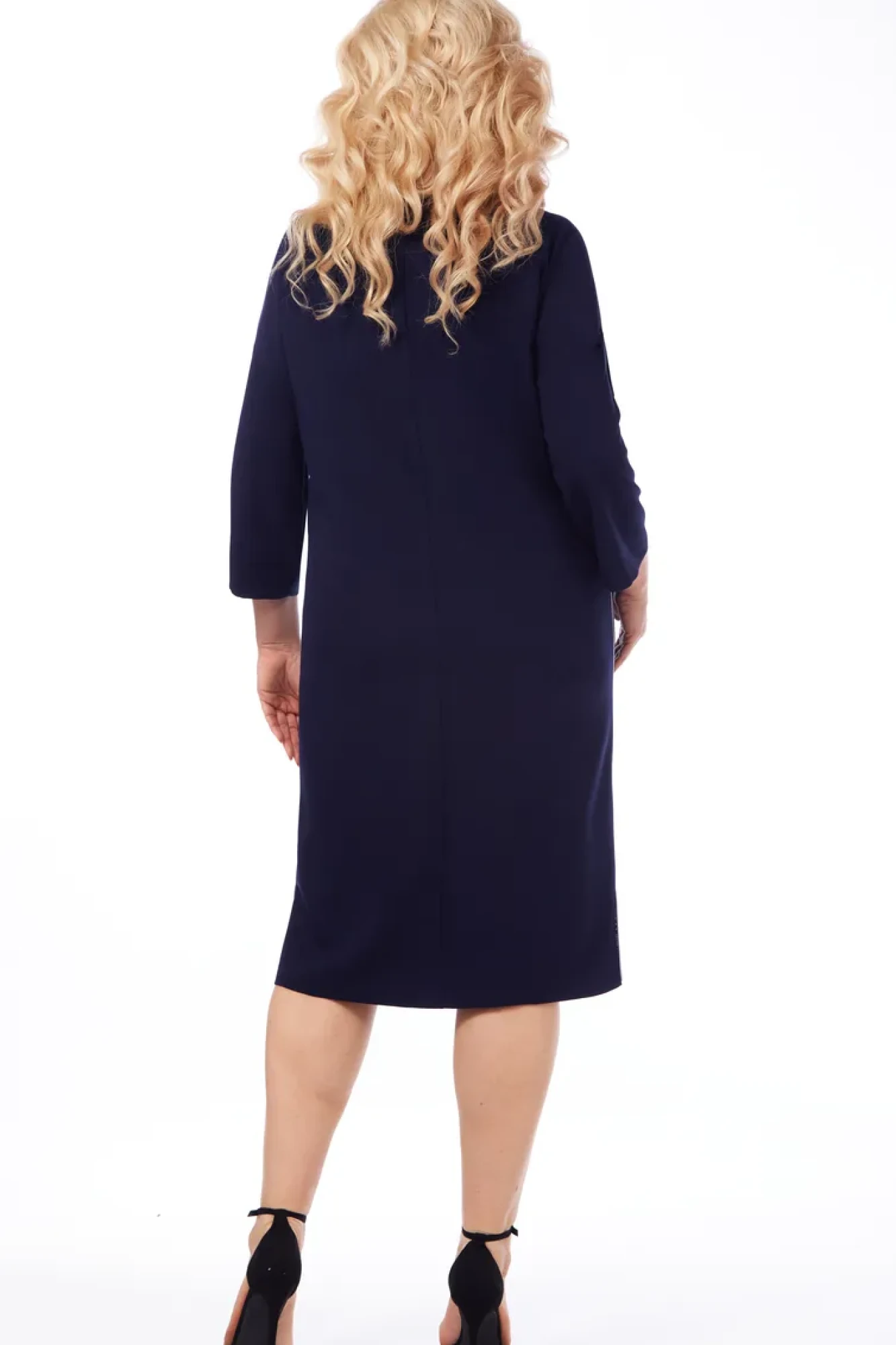 Платье женское,прямого силуэта,рукав цельнокроеный коротки. Застежка молния по центру переда до уровня груди. Воротник рубашечный с отрезной стойкой. По переду на уровне линии бедер 2 накладных кармана,с правого боку выполнена печать. В боковых швах разрезы и настрочена декоративная тесьма.
