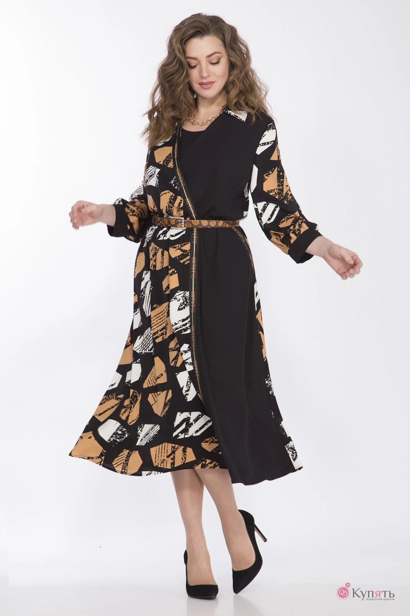 Платье женское отрезное по линии талии на резинке. Лиф переда и юбки с имитацией запаха, отдекорирован тесьмой. Воротник с отрезной стойкой. Рукав втачной, на манжетке.