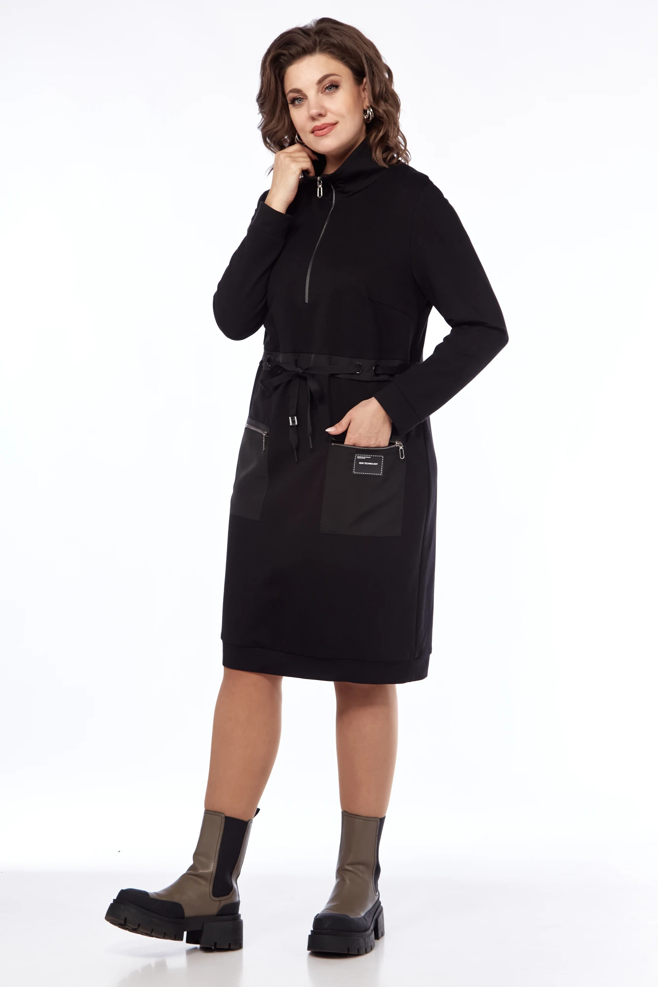 Платье женское прямого силуэта, выполнено из трикотажного полотна с использованием отделочной плащевой ткани. Платье с отрезной манжетой по низу изделия, нагрудными вытачками из боковых линий, с отрезным воротником стойкой на тесьму-молнию. Перед отрезной по талии со вставкой на кулису и накладными карманами. Накладные карманы на декоративной молнии. Рукав втачной, одношовный, полной длины, на отрезной манжете.