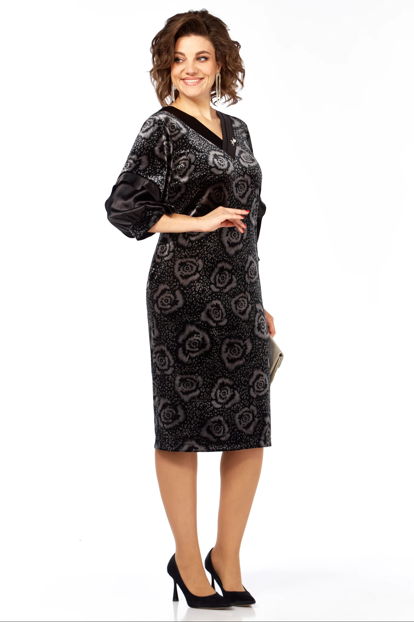 Платье женское прямого силуэта, из бархатного полотна с отделкой из однотона. Перед платья с нагрудными вытачками из боковых швов, V-образным вырезом горловины, обработанным декоративными планками из отделочной ткани, на планки нашит декоративный элемент. Спинка со средним швом и шлицей на движение в нем. Рукав втачной одношовный, на манжете, с отрезной деталью по низу и декоративной рюшей.