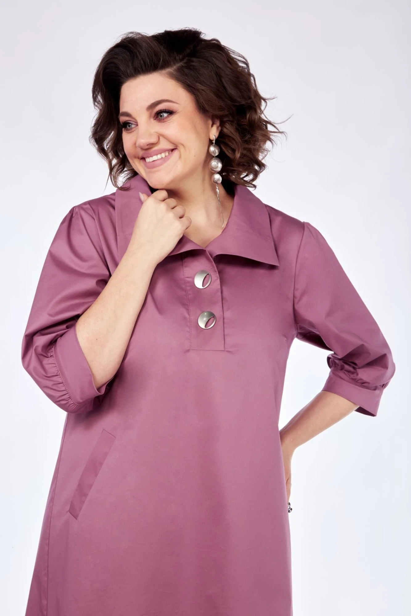 Платье женское полуприлегающего силуэта к низу имеет форму - баллон. Перед платья с нагрудными вытачками из боковых швов, косыми карманами с листочкой, и вытачками от низа изделия. Воротник отложной с планкой на 2 декоративные пуговицы. Спинка с центральной декоративной планкой и 4 пуговицами. Платье со складками на боковых швах. Рукав втачной одношовный, на манжете по низу, со сборкой по окату и по низу рукава.
