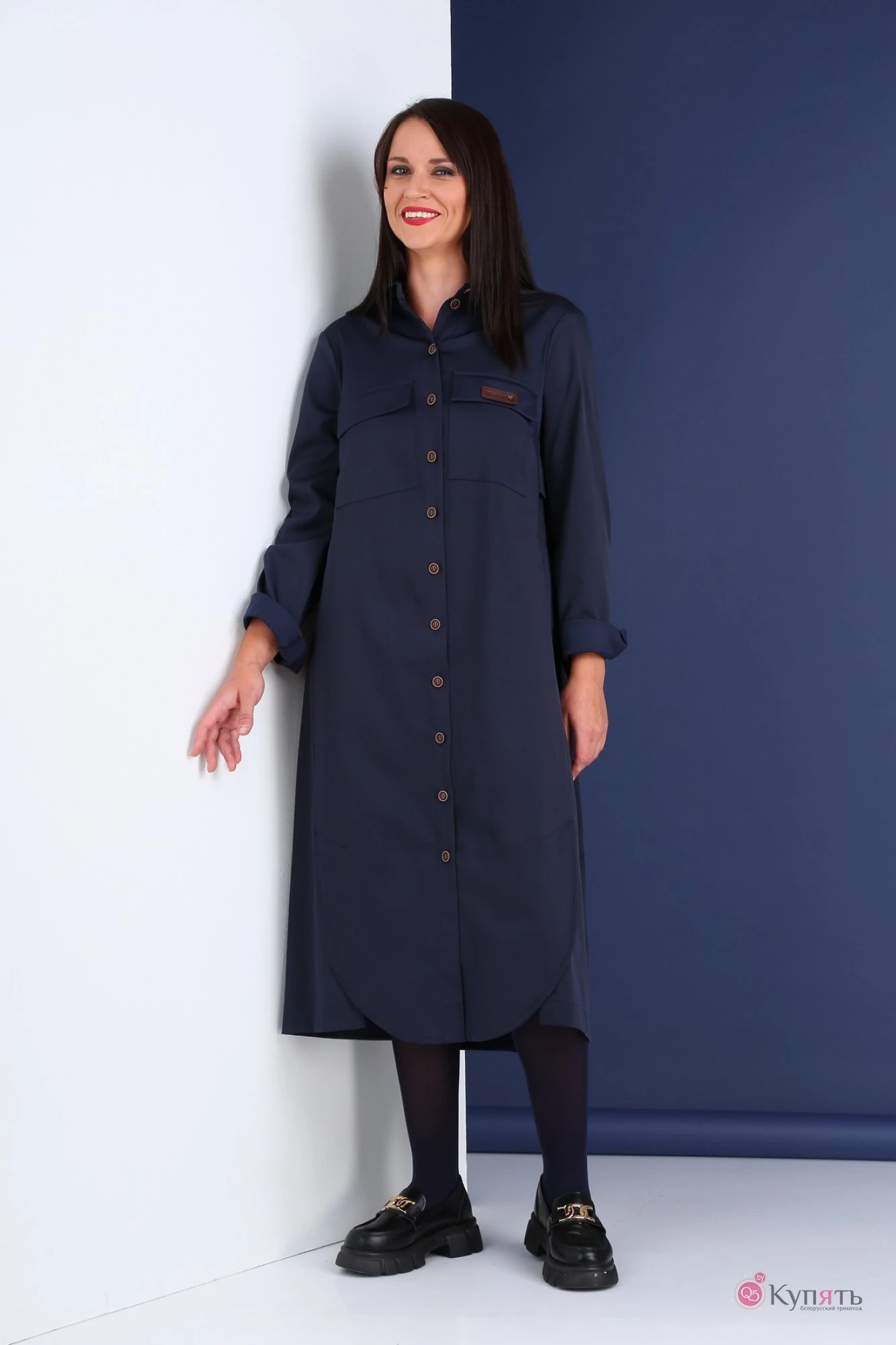 Платье-рубышка прямого силуэта. Полочка с центральной бортовой застежкой на петли-пуговицы. В верхней части полочки накладные карманы с клапаном, а также карманы в боковых швах. Спинка отрезная по линии лопаток, нижняя часть с двумя бантовыми складками. Шов притачивания скрыт отлетной кокеткой. Рукав втачной двухшовный. По низу рукава притачной манжет. Воротник отложной на стойке.