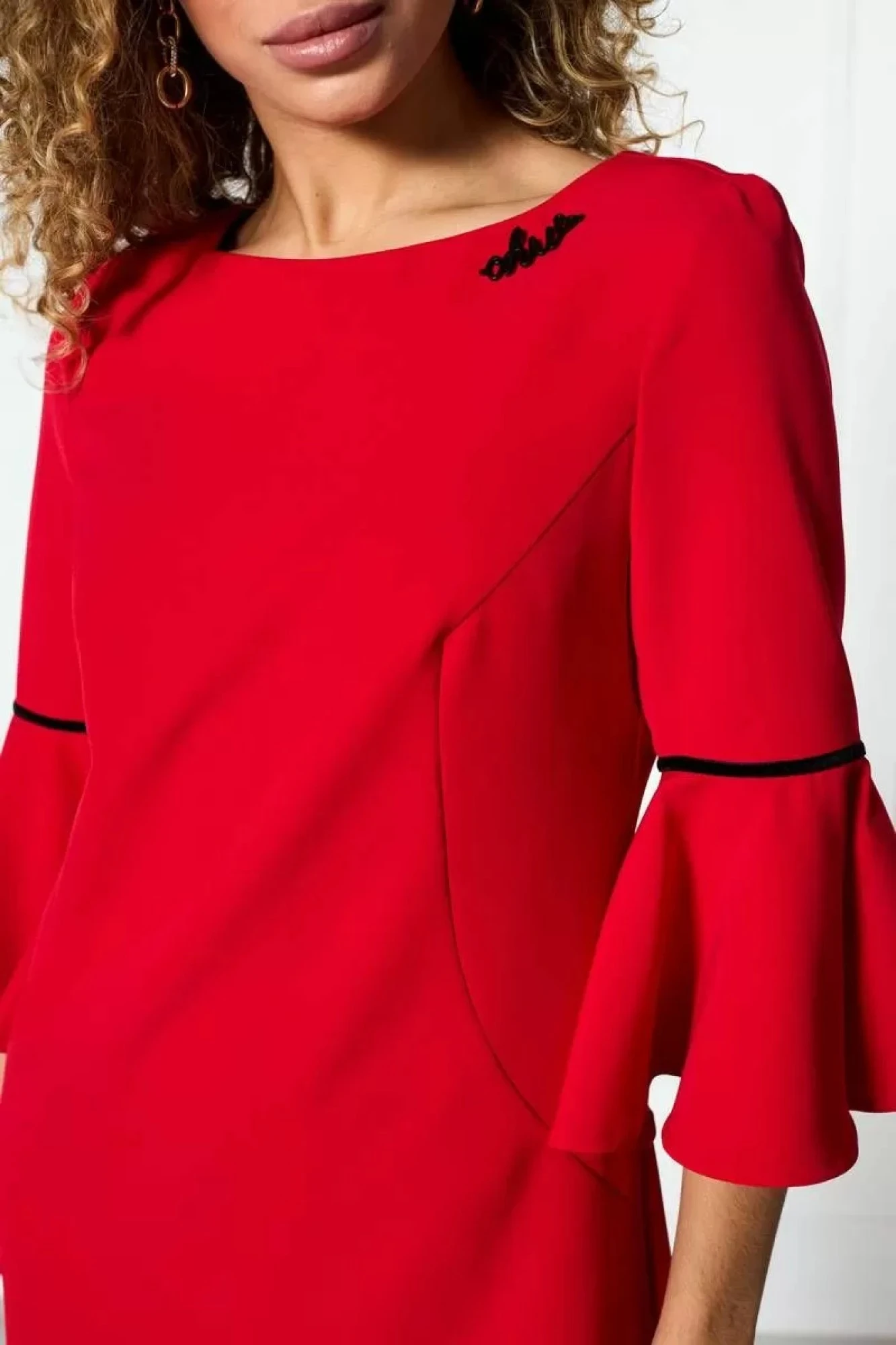 Платье полуприлегающего силуэта. По переду полурельефы. По спинке от горловины до низа две декоративные складки. Застёжка на потайную застёжку-молнию. Рукав 3/4, втачной, двухшовный. В нижней части рукав оформлен декоративной тесьмой.