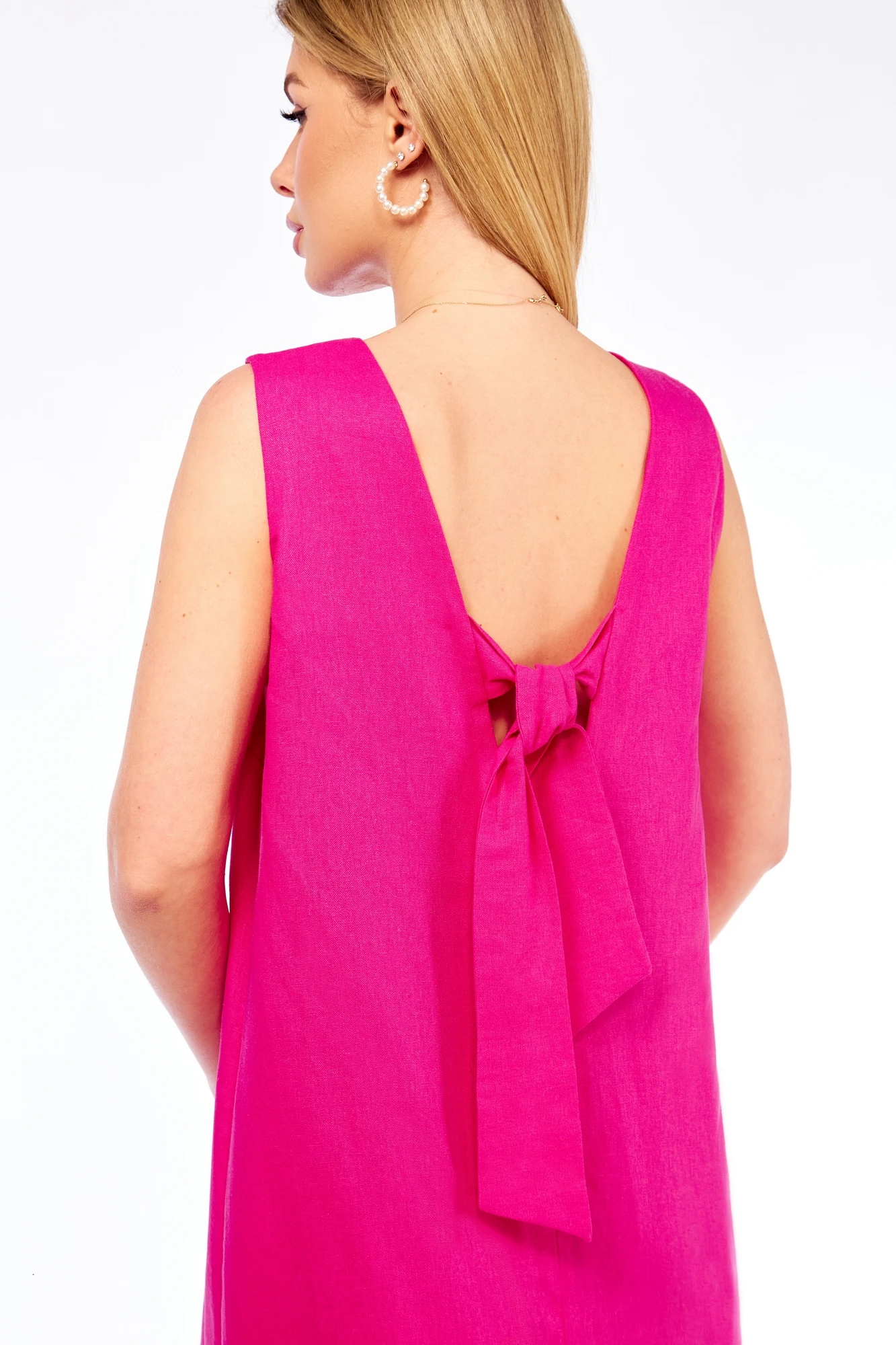 Платье чуть расширенного к низу силуэта, по переду и спинке V-образный вырез горловины. Фиксация ширины спинки на завязку-пояс. Платье с карманами и разрезами по низу.