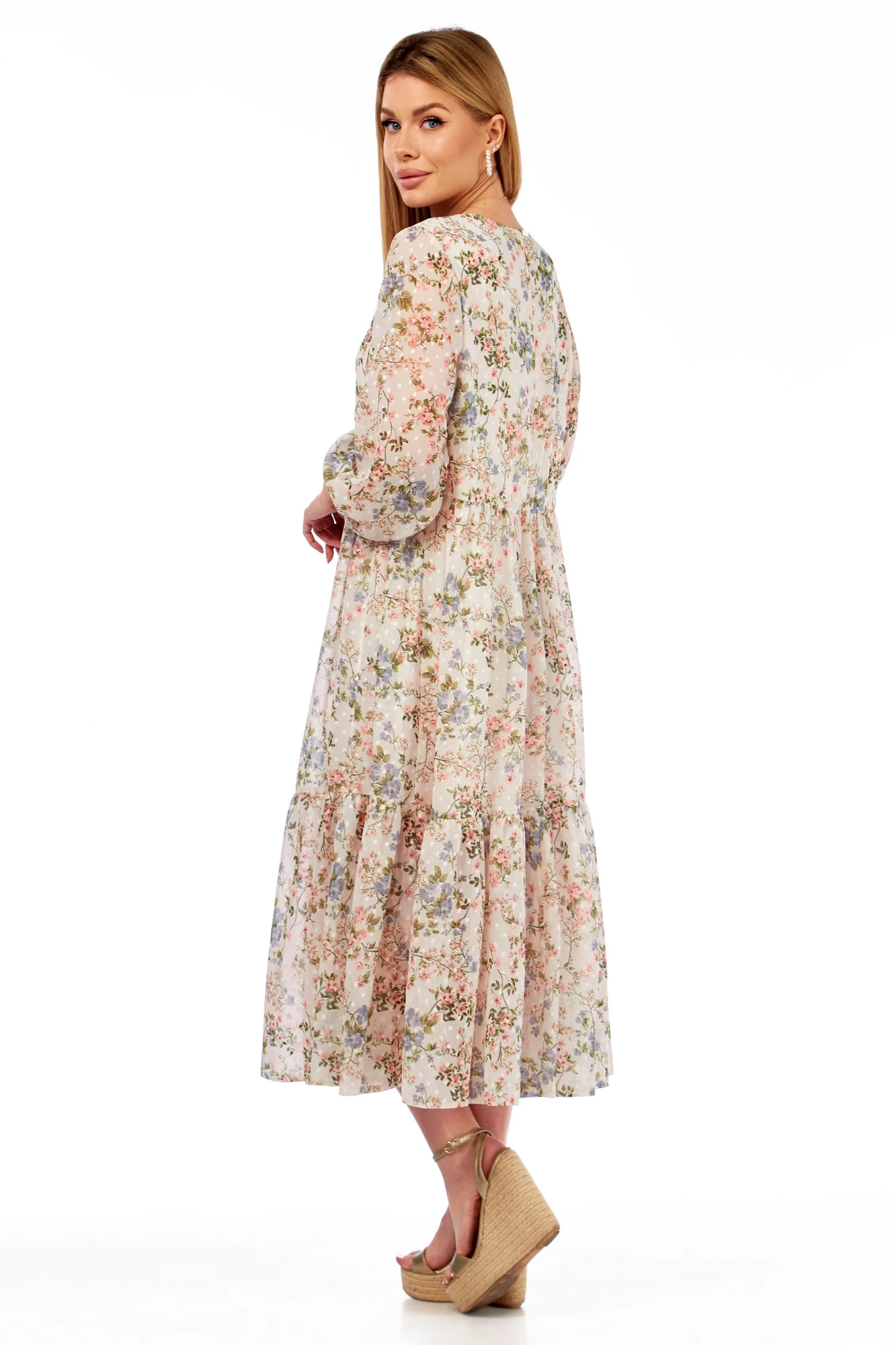 Платье трапециевидного расширенного к низу силуэта. Рукав 7/8 втачной. Низ рукава с эластичной тесьмой. Застежка по центру спинки на одну навесную петлю и пуговицу.