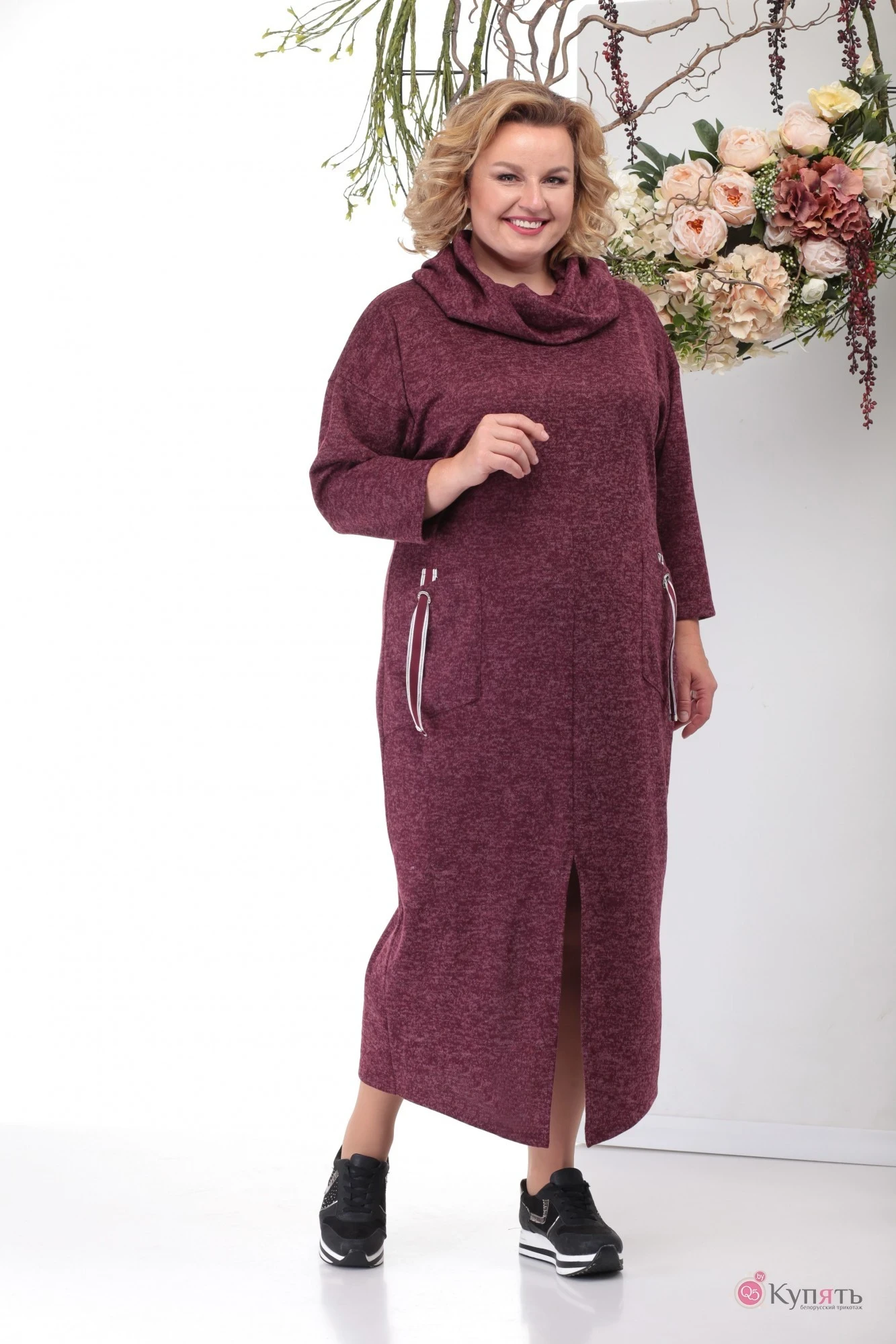 Повседневное удлиненное платье, выполнено из меланжевого трикотажа, полуприлегающий силуэт хорошо садится по фигуре скрывая любые недостатки. Центральный шов по переду переходит в разрез до колена, удлиняя силуэт. Рукав приспущенный, длина 7/8. Украшением служат объемный воротник, который прекрасно прячется под верхней одеждой и украшенные декоративной тесьмой и блочками со стразами карманы. Идеально сочетается с различной по стилю обувью и бижутерией. Длина по спинке 124+-1см.; длина рукава от горловины 62см.