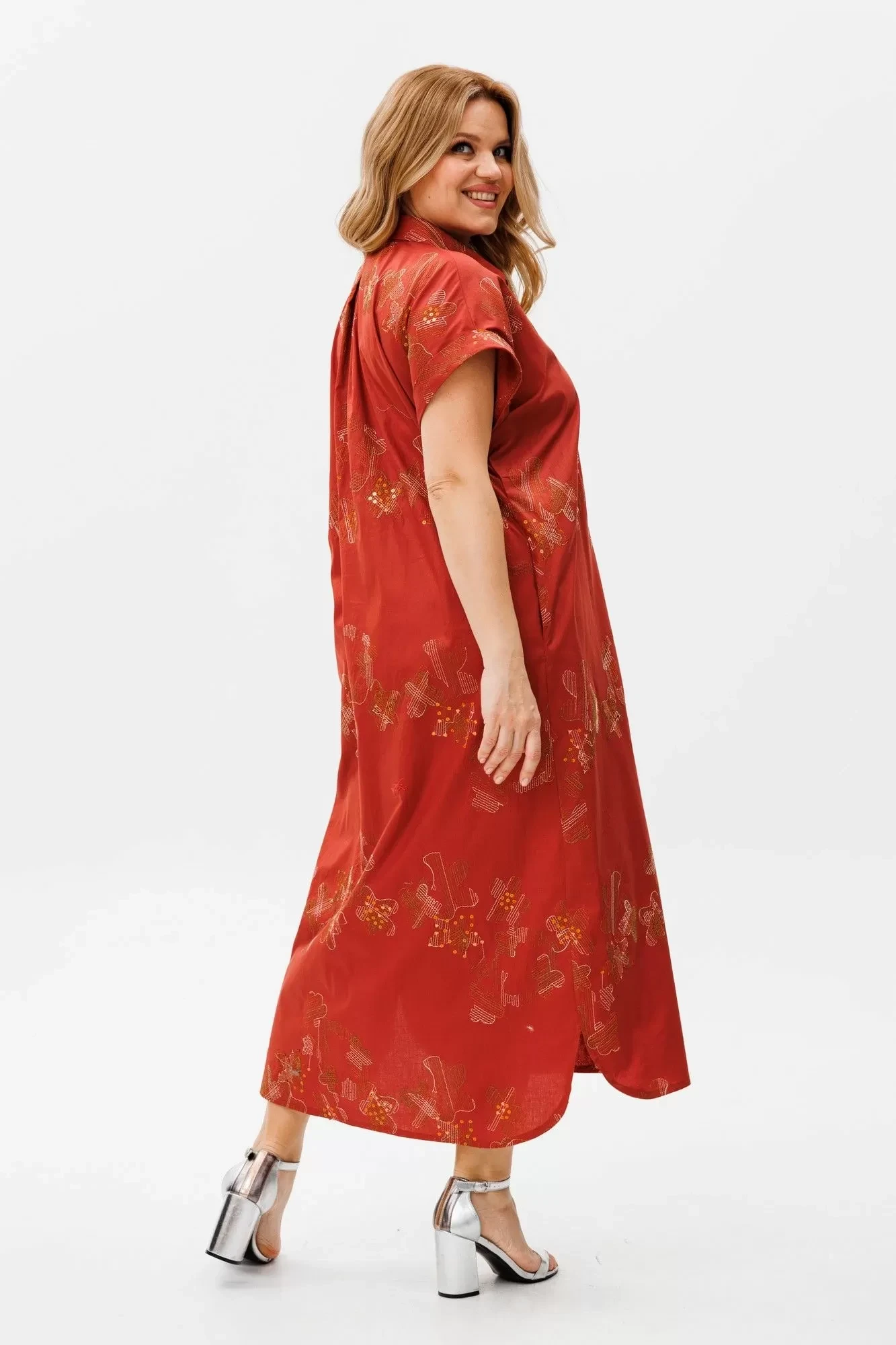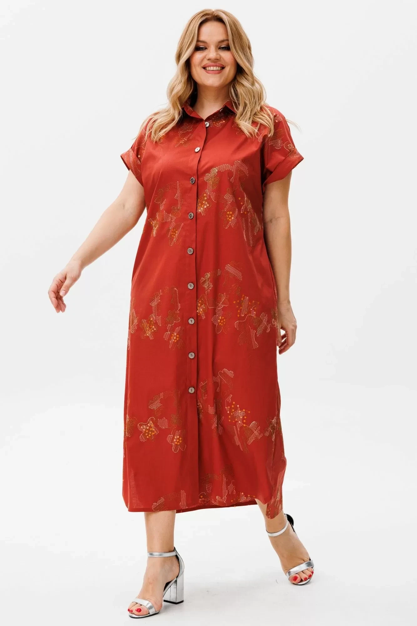 Платье рубашечного типа, свободного кроя - выполнено из приятной на ощупь хлопковой ткани с пайетками. Универсальность кроя и легкая ткань сделают его любимым изделием Вашего гардероба в летний сезон. По переду застегивается на пуговицы, снизу сбоку разрез, по спинке длиннее. Рукав короткий цельнокроеный приспущенный на отложенной манжете. Благодаря встречной складке на спинке имеет небольшое клешение.