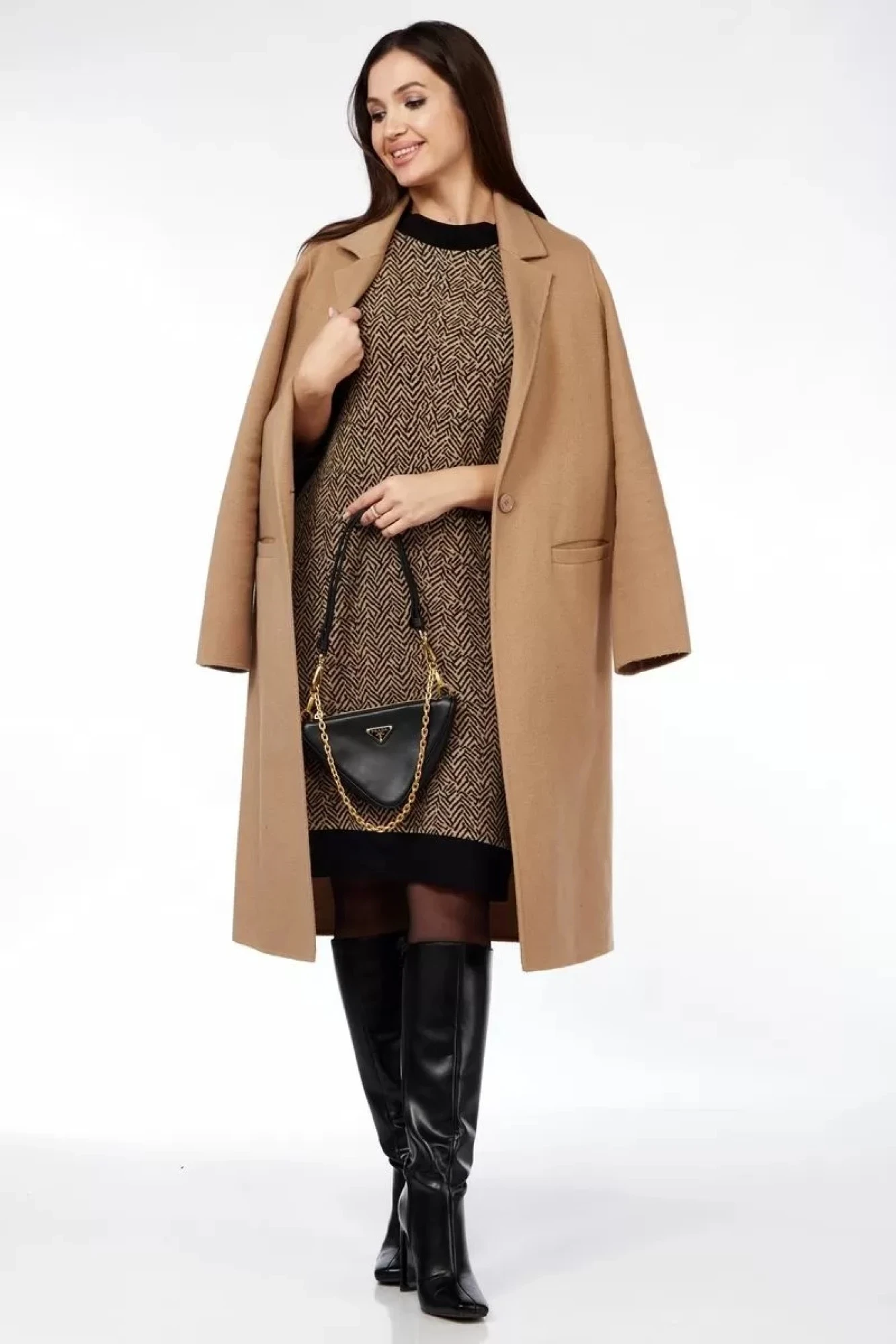 Универсальное трикотажное платье-туника прекрасно впишется в Ваш гардероб. Изделие прямого силуэта свободного кроя с накладными карманами, украшением на кармане служит небольшая брошь. Рукав ¾, манжет рукава, а также горловина и низ платья — трикотаж. Простое, но такое комфортное изделие станет одним из ваших любимых в осенне-зимний период. Платье отлично смотрится, как самостоятельное изделие, а также смело может сочетаться с различной одеждой и обувью.