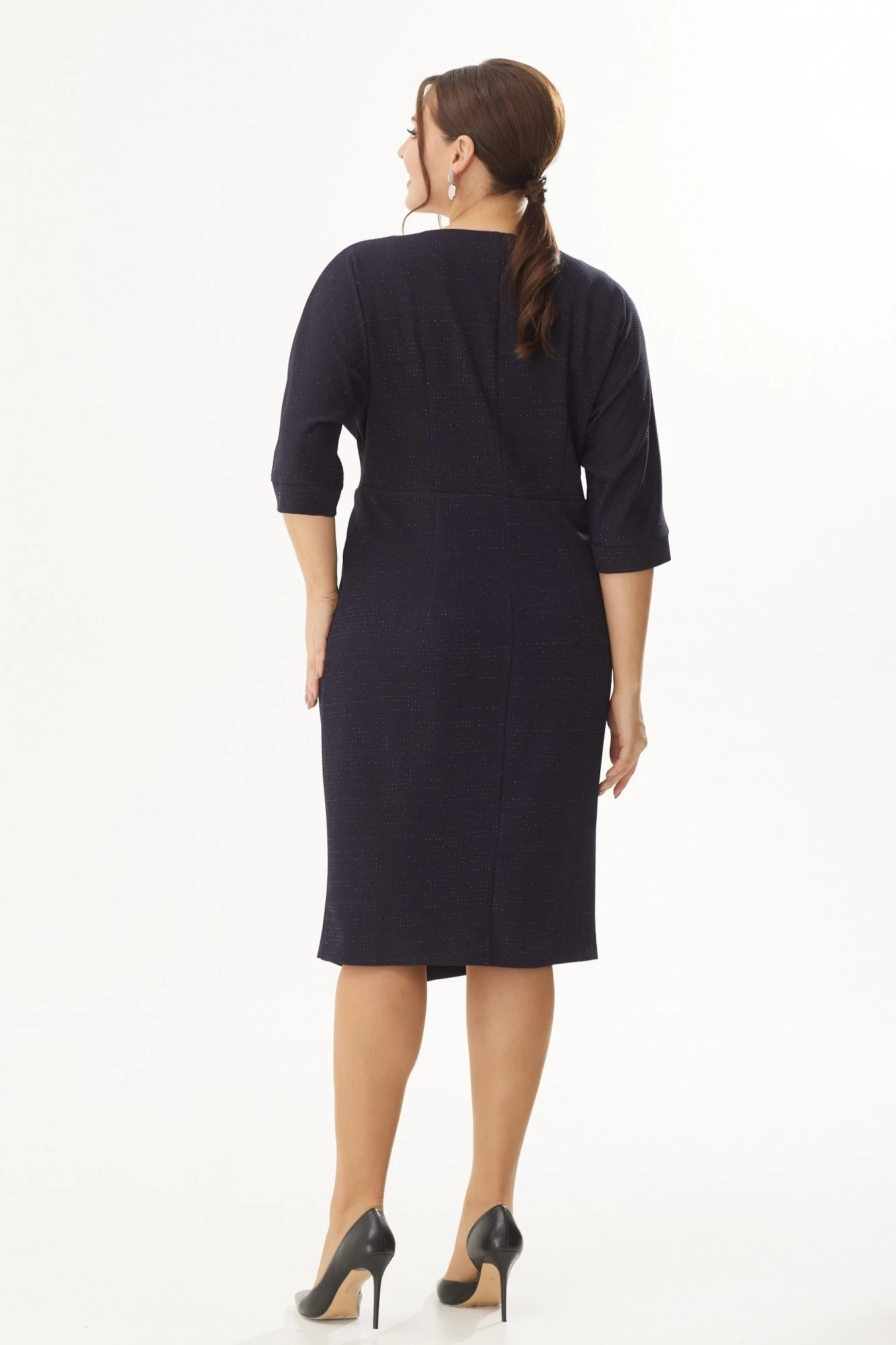 арядное женское платье из фактурного трикотажа в люрексовую точку прекрасно подойдет для рабочих будней, а также торжественных мероприятий. Перед и спинка изделия с центральным и таливым швами, застроченные встречные складки на лифе служат вытачками, а в юбке дают дополнительный объем и необычный силуэт. Платье заужено к низу. Передняя часть удлинена и имеет разрез. Рукав "летучая мышь" цельнокроеный 3/4, с пристроченной манжетой. Горловина лодочка с разрезом, который украшает цепочка вставленная в блочки.