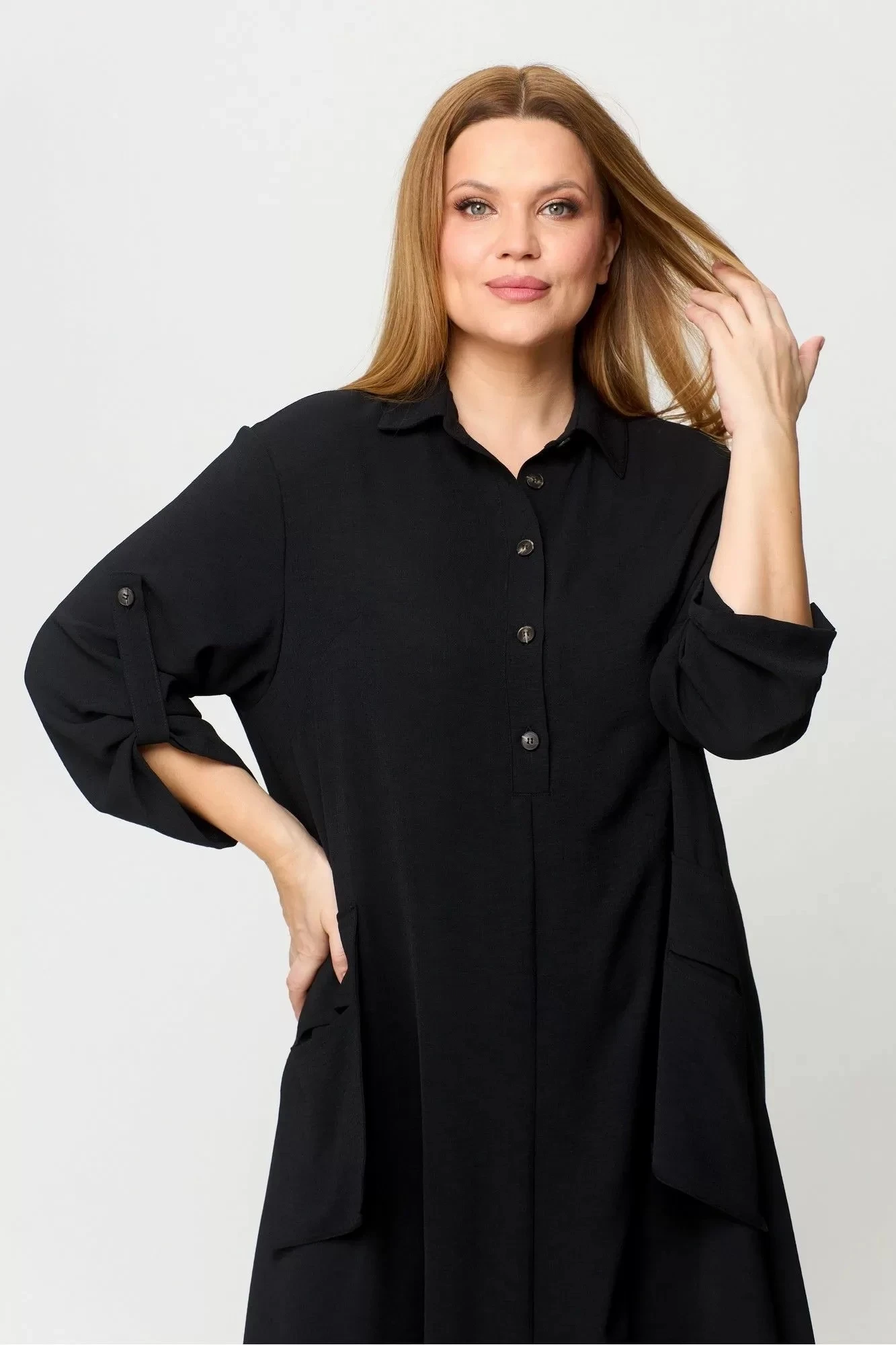 Универсальное платье в стиле «бохо» из плательной ткани. Изделие с рубашечным воротником застежкой на пуговицы, перед с центральным швом и выточками по всему низу, создающими воздушность и объем в нижней части платья. По спинке центральный шов и застроченная встречная складка от горловины, создающая небольшое клешение. По бокам разрезы. Плечо спущенное с втачным длинным рукавом, который регулируется с помощью паты и пуговицы. Украшением изделия служат два больших отлетных кармана. Изделие может сочетаться как с кедами, лоферами, так и с туфлями и босоножками. Универсальность и практичность платья сделают его любимым в Вашем гардеробе в наступающем сезоне