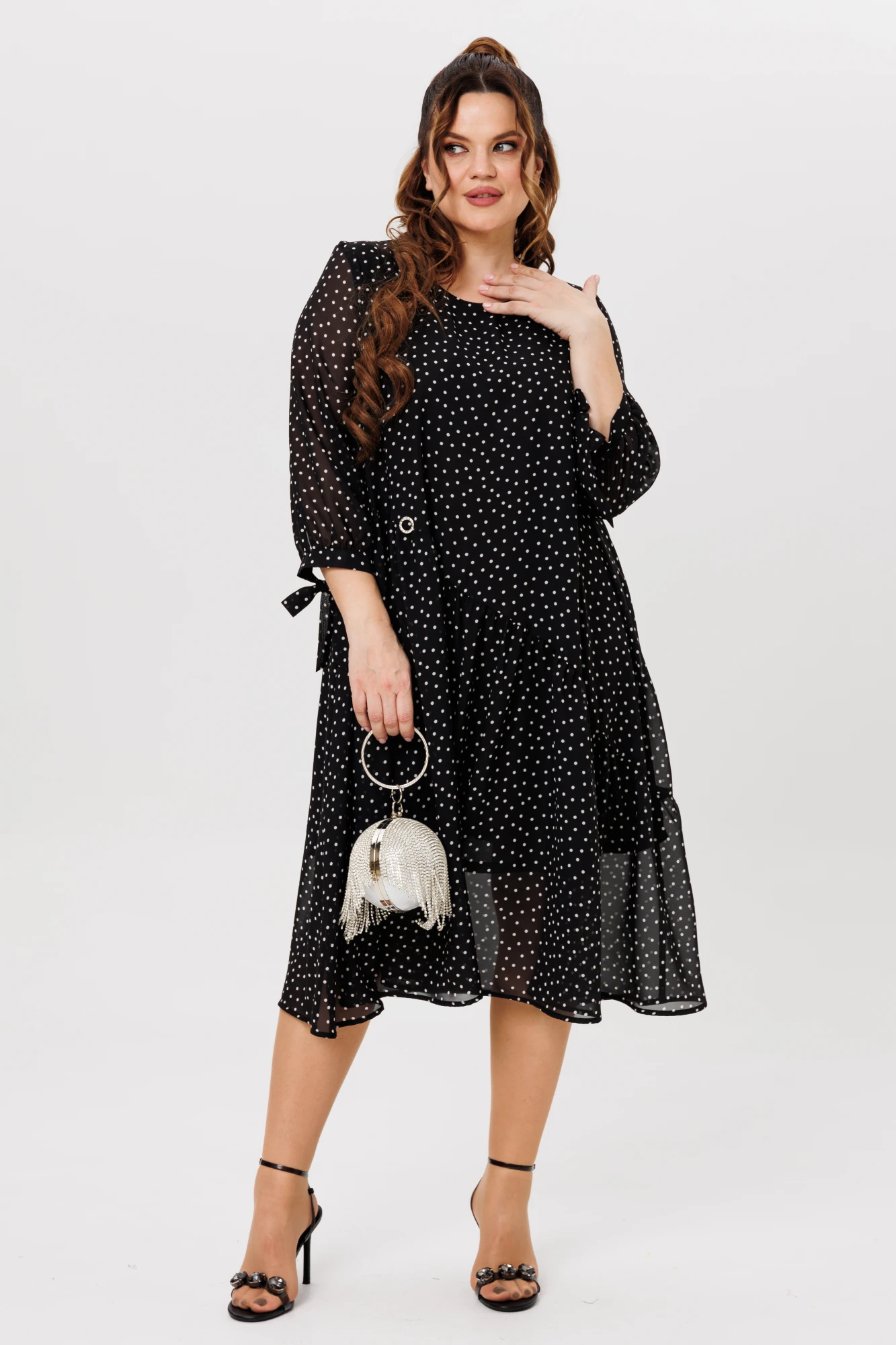 Нарядное двухслойное платье в классической расцветке (черное в белый горох) на облегченной подкладке — идеально подойдёт для любых торжеств. Интересная расцветка, легкий и струящийся шифон, а завязки на рукавах — сделают изделие еще более выразительным. Платье с округлой горловиной, длина ниже колена и трапециевидный крой — подчеркнут Ваши достоинства и не будет сковывать движения. По переду косой подрез и волан на сборке из-под него, украшено кольцом со стразами; спинка прямая. Платье прекрасно дополняется различными аксессуарами.