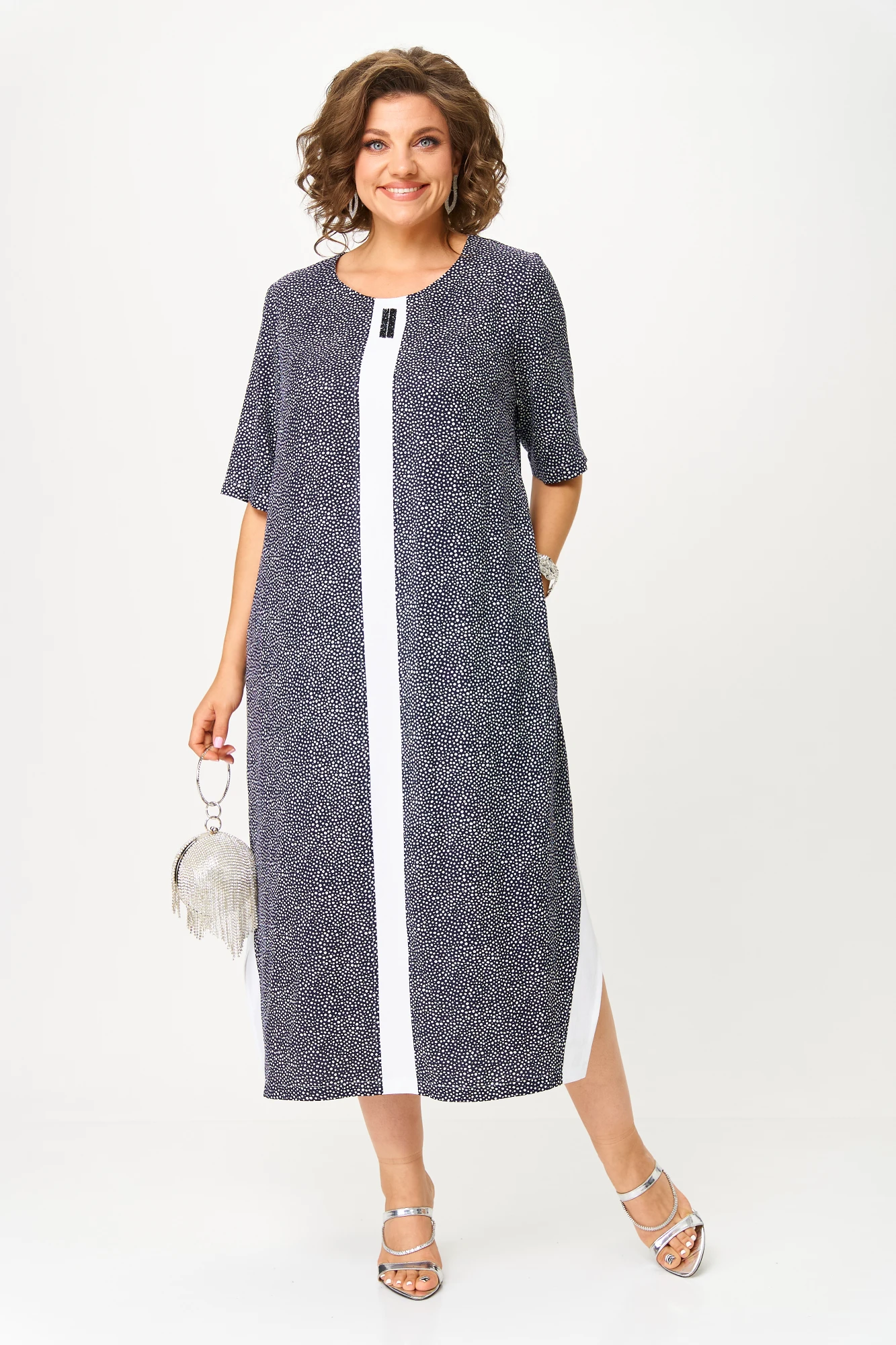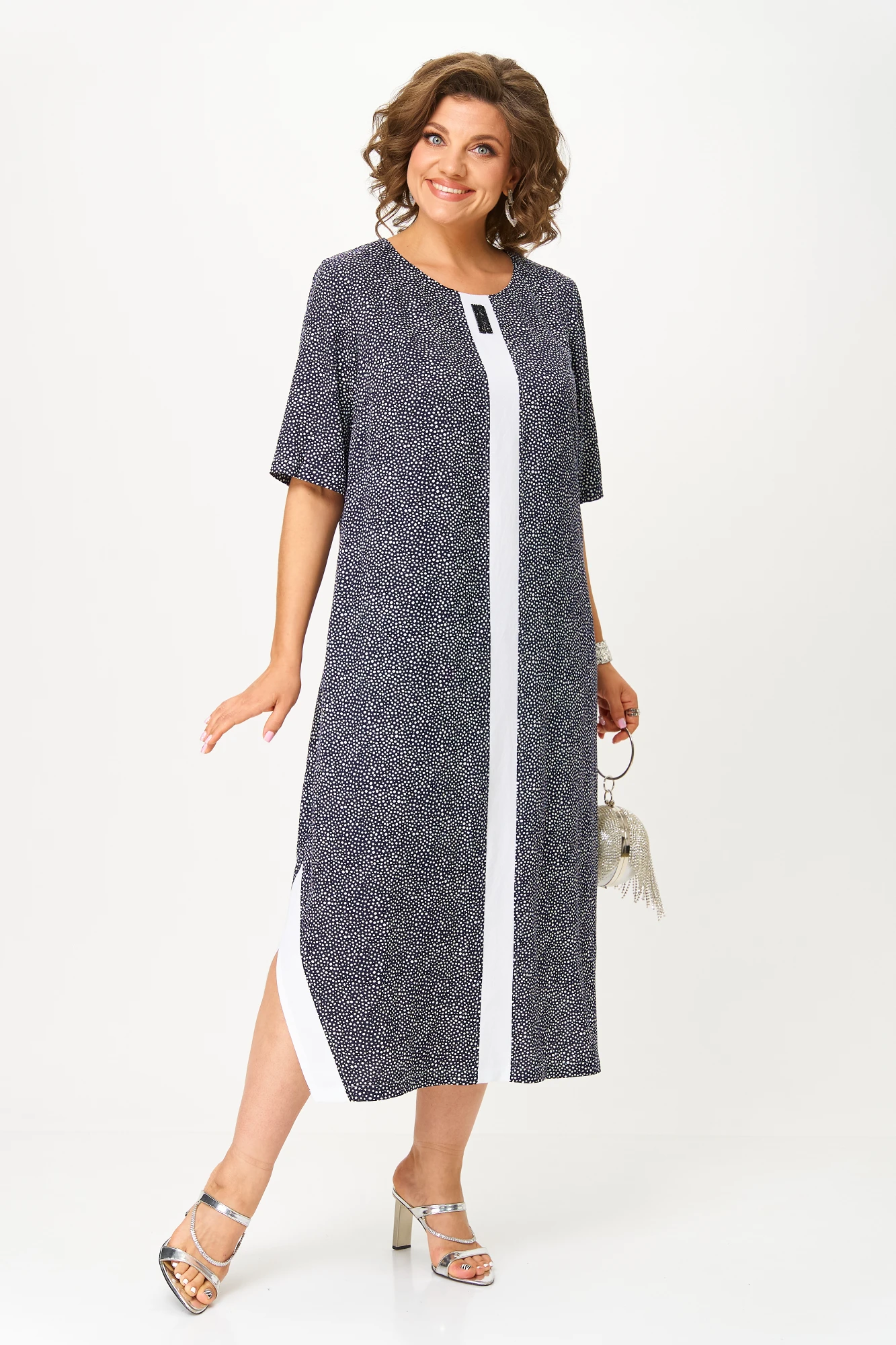 Платье в стиле casual нарядно-повседневное, прекрасно сочетается с любой по стилю обувью. Платье выполнено из вискозы ,что придает легкость изделию. Платье свободного кроя, ниже колена, рукав укорочен. В качестве декора по переду изделия — вставлена планка из контрастной ткани, на планке нанесены стразы. По бокам изделия — разрезы, которые также обработаны контрастной тканью, в цвет декоративной планки.