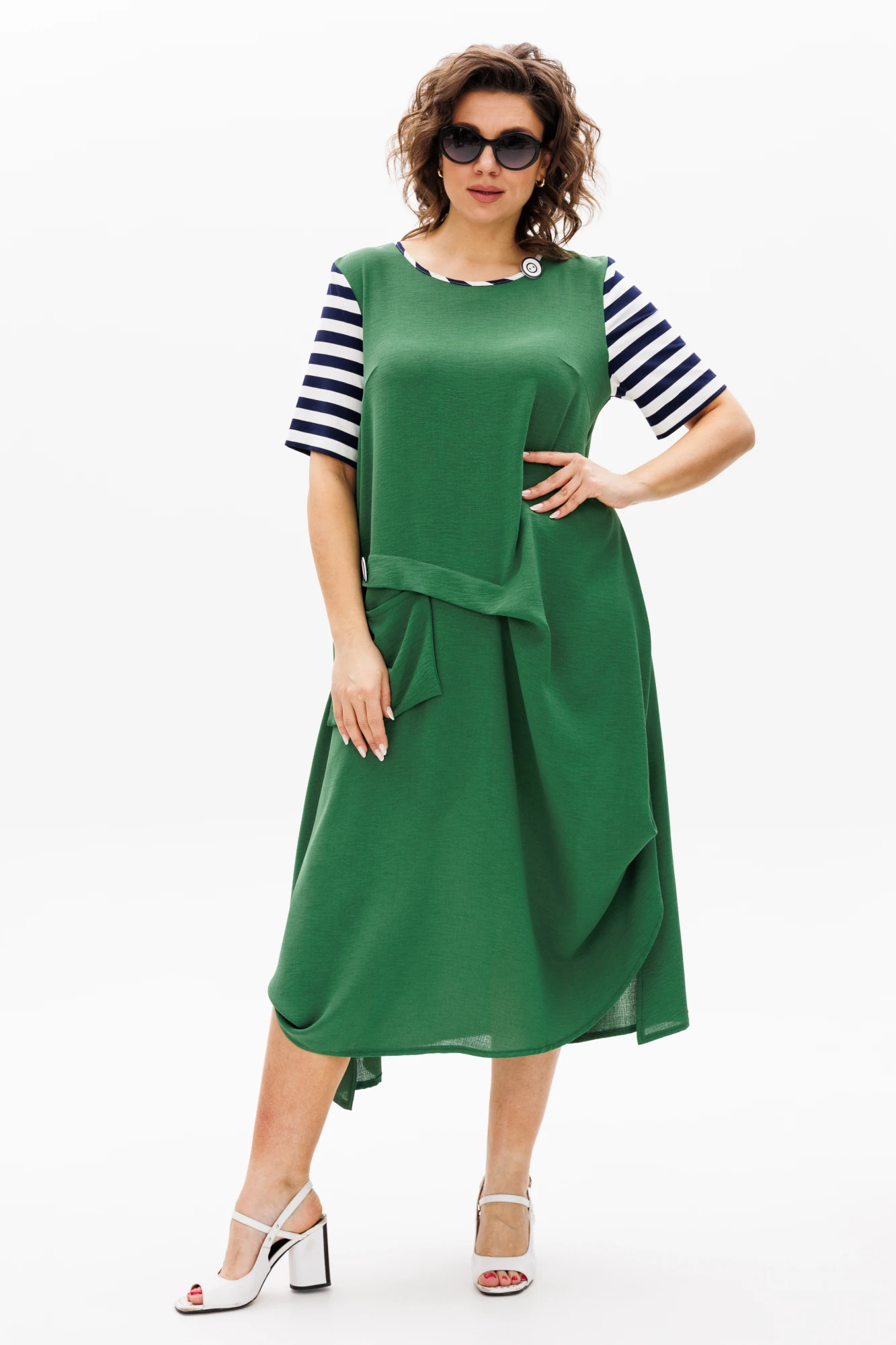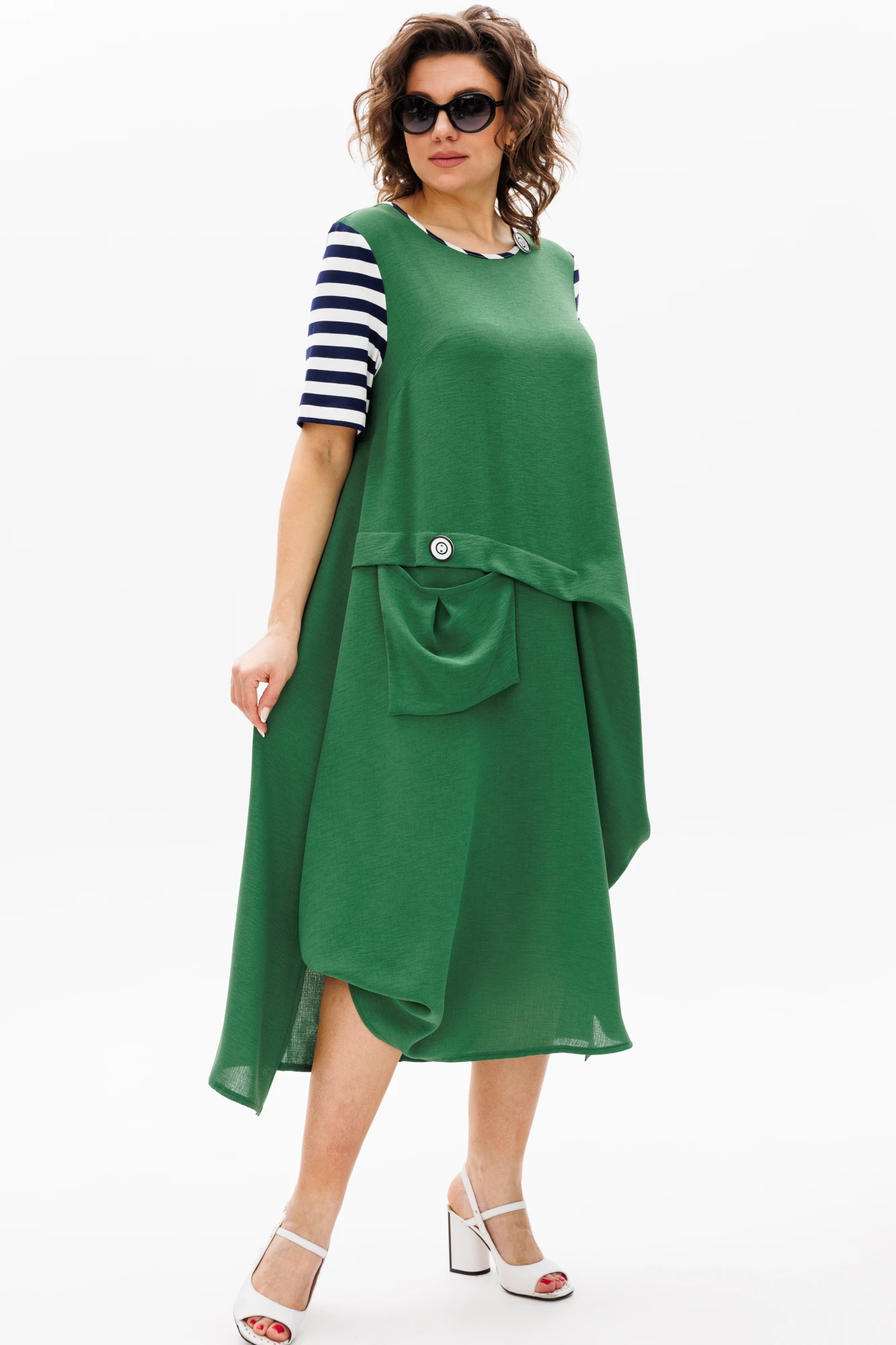Универсальное и комфортное платье на любой случай вашей жизни. Платье выполнено в стиле «бохо». Платье средней длины, с круглым вырезом, с коротким рукавом. По переду изделия настрочен отлетной накладной карман-мешок. В боковом шве — разрез. Рукава платья и отделка горловины выполнены из ткани- компаньона.