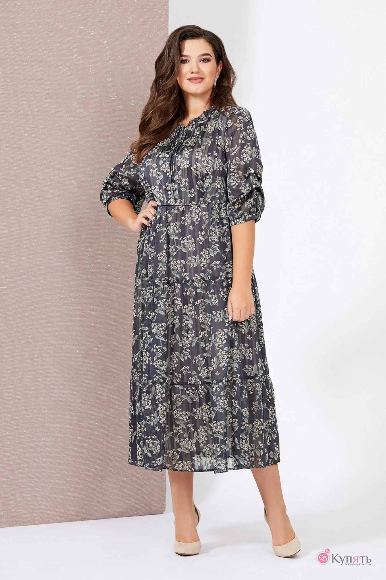 Роскошное женское платье свободного силуэта, выполнено из нежного шифона с принтом, на подкладке. Лиф платья подрезной ниже линии груди, с рельефами и застежкой на планку с пуговицами. Горловина декорирована рюшей и завязкой. Нижняя часть платья состоит из трех воланов слегка присборенных по шву притачивания. Рукав втачной, 3/4, из шифона с декоративными защипами на пуговицы, низ присборен на манжет. Спинка идентична полочке, также с подрезными воланами на сборку по шву притачивания.