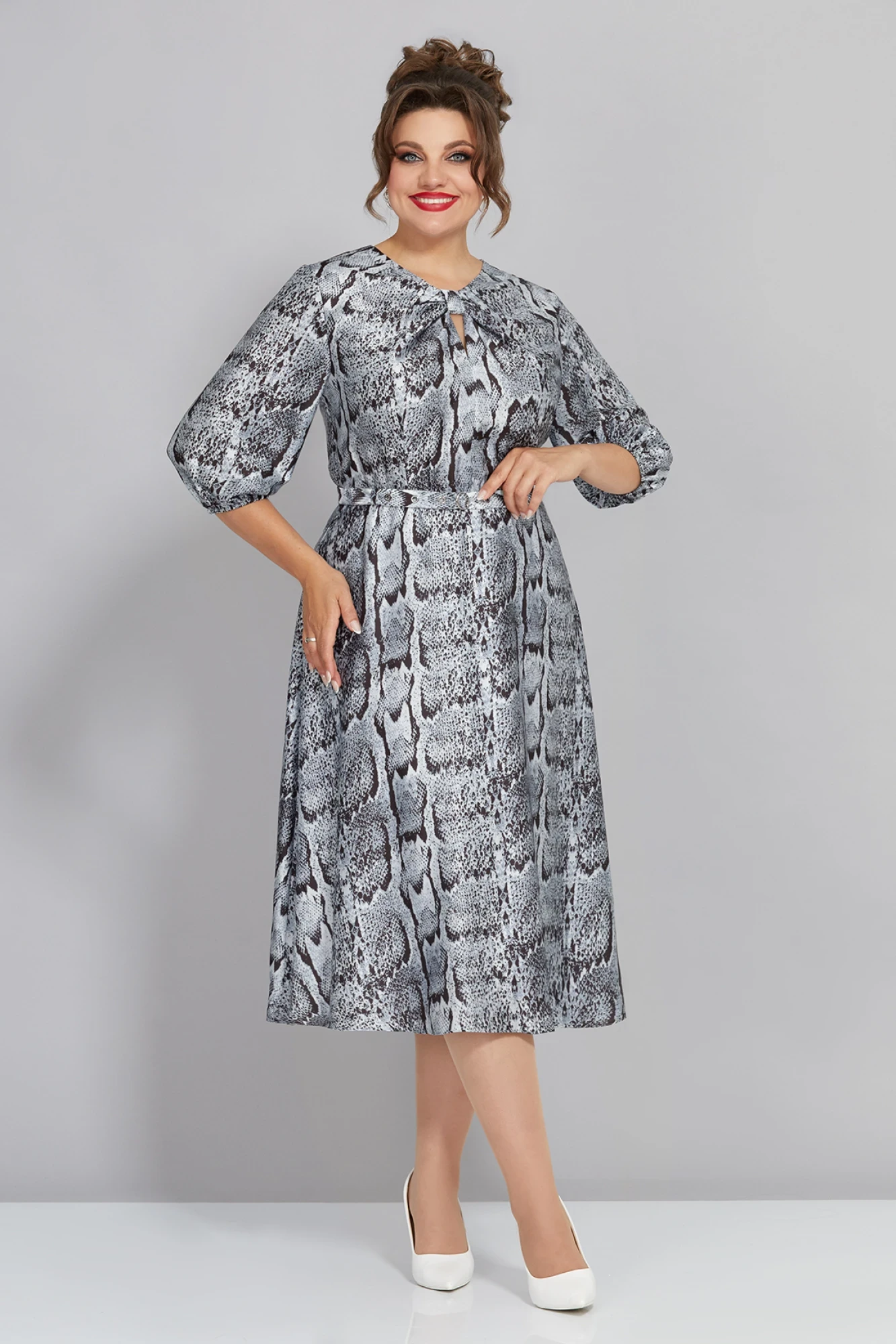 Стильное женское платье полу-прилегающего силуэта, выполнено из принтованного атласа, на трикотажной подкладке. Лиф платья отрезной по линии талии, на талии вставлена резинка для комфорта надевания, также на полочке выполнены вытачки, а по горловине декоративный узел в виде банта. Юбка платья А-образного силуэта, на подкладке, рукав втачной, оптимальной длины, выполнен из основной ткани, по низу присборен на резинку. Спинка идентична полочке, со средним швом и вытачками. В качестве дополнения к платью в комплекте есть пояс выполненный из основной ткани. Платье в трендовой расцветке беспроигрышный вариант для любого случая!