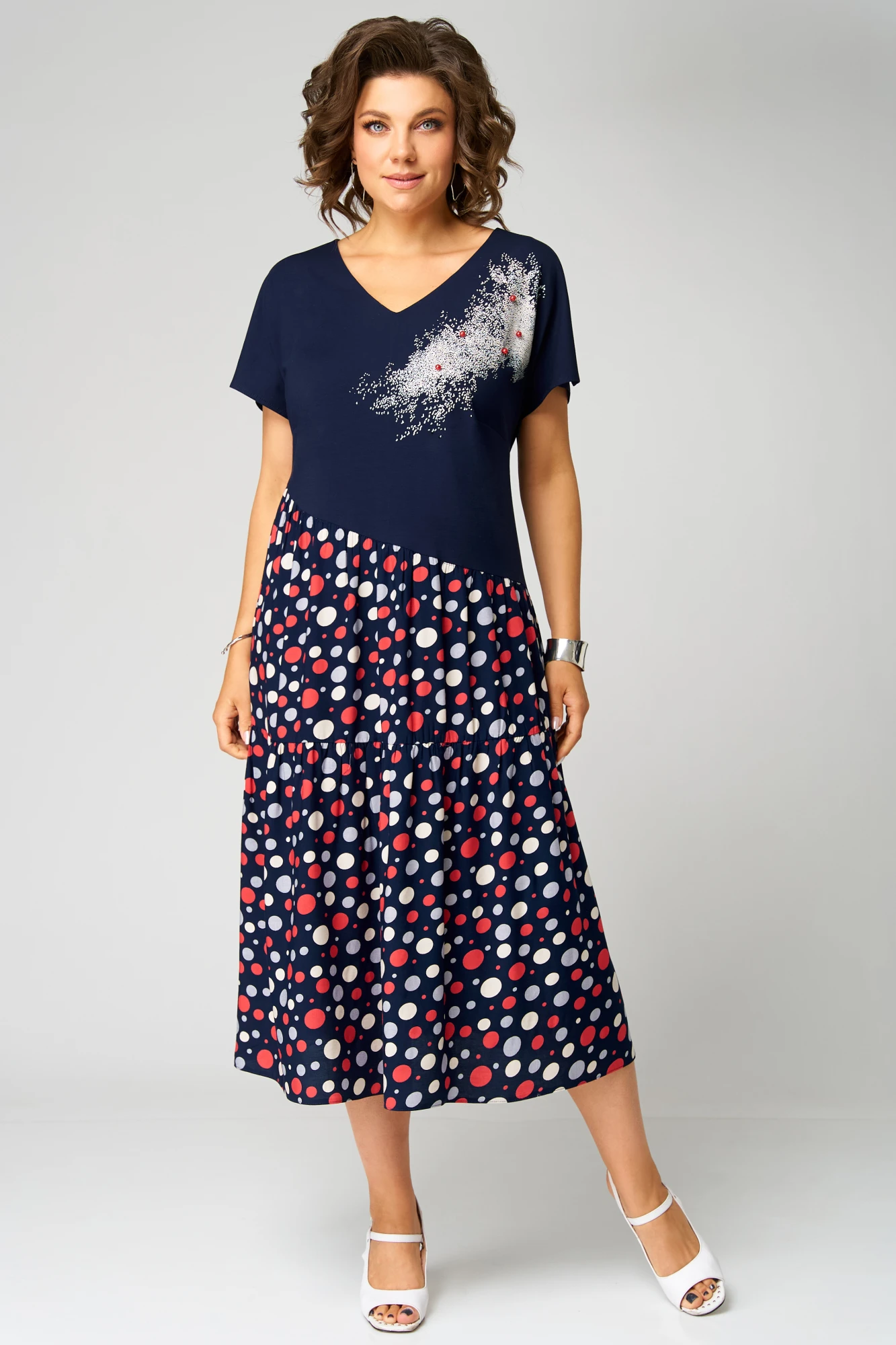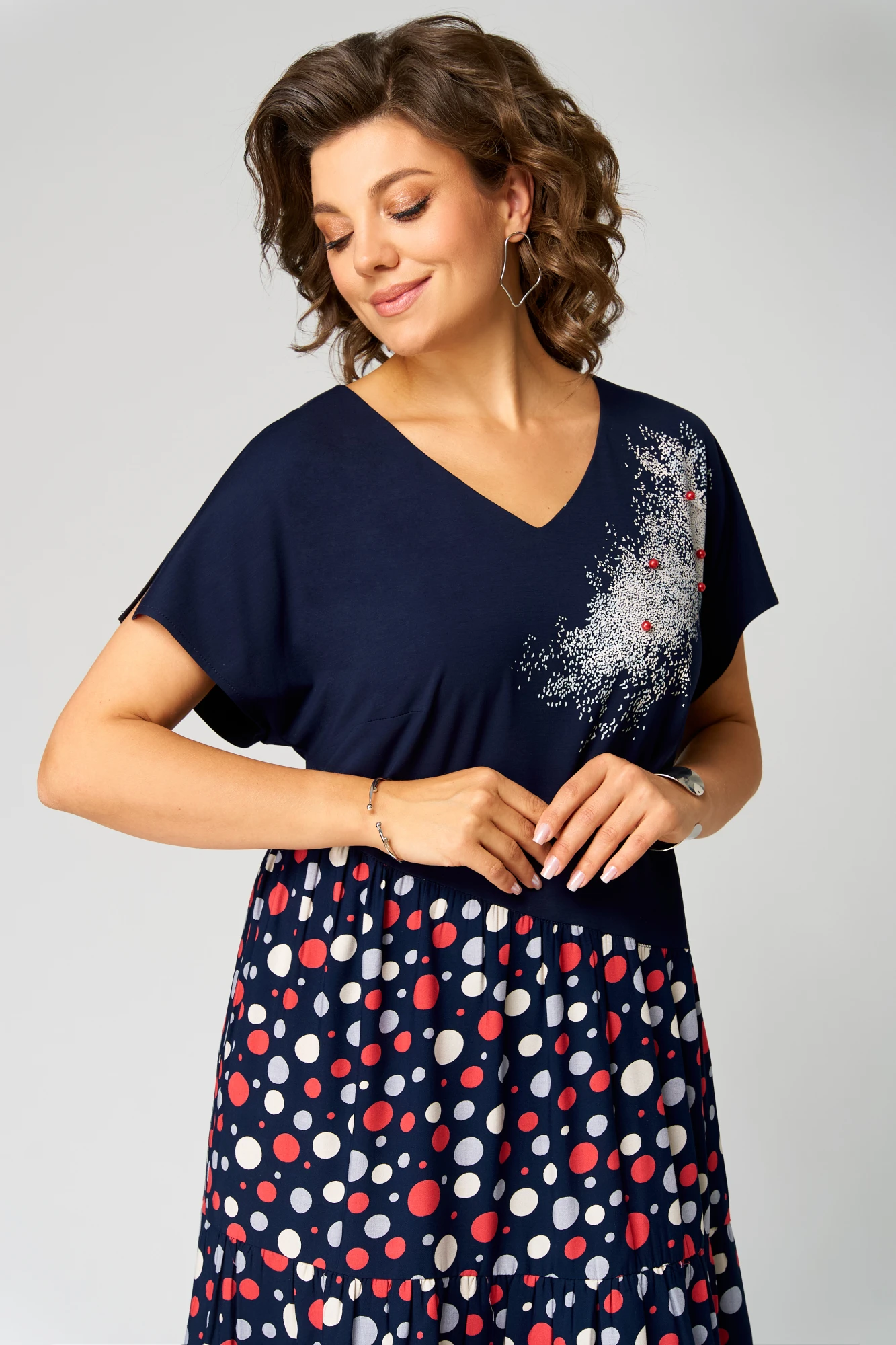 Платье, в котором комфортно - платье А- силуэта с ассиметричным подрезом лиф выполнен из трикотажного полотна, юбка из штапеля принт в «горохи». Горловина с V-образным вырезом. По переду с правой авторская печать и расшитыми бусинами. По юбке волан с легкой сборкой. Платье без подкладки.