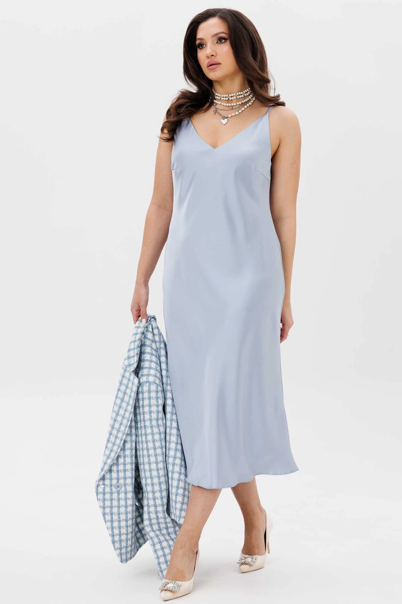 Платье-комбинация прямого силуэта из атласной ткани. Перед с нагрудными вытачками. Платье на узких бретелях.
