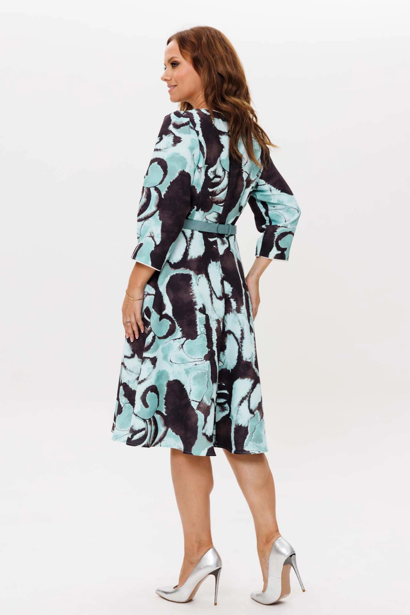 Платье женское полуприлегающего силуэта отрезное по линии талии. Лиф переда с нагрудными и талевыми вытачками. Горловина круглая. По среднему шву спинки сверху застёжка потайная молния. Юбка расклешённая. Рукава одно шовные втачные, по низу рукава встречная складка, по окату в области плеча небольшая сборка. Изделие дополняет ремень. Платье без подкладки.