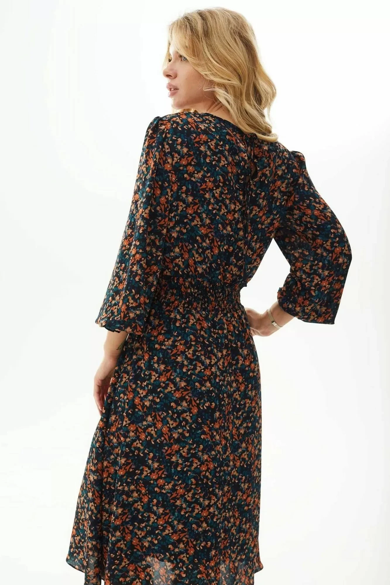 Платье женское свободного силуэта, отрезное по линии талии, расклешённое к низу, выполнено из ткани шифон. По линии талии сборка на резинку «венгерку». Горловина круглая со сборкой по переду и на завязке по спинке. Рукава одно шовные втачные, по низу сборка на резинку «венгерку». Платье на тонкой трикотажной подкладке.