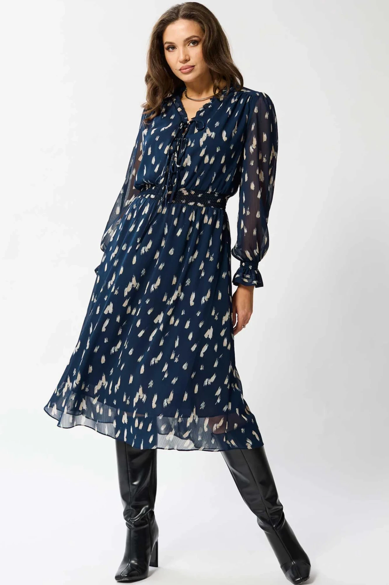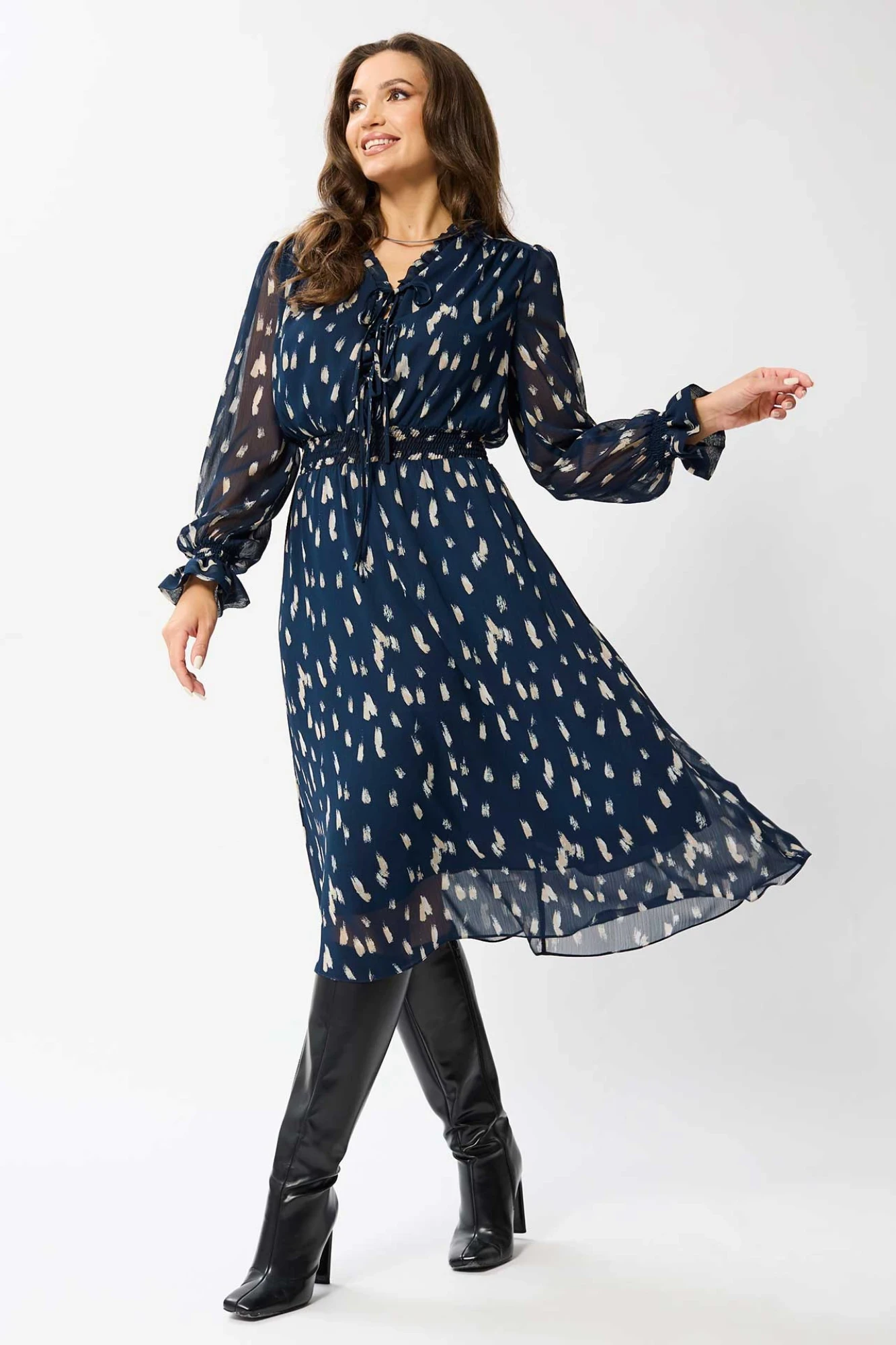 Платье женское свободного силуэта, отрезное по линии талии, расклешённое к низу, выполнено из ткани шифон. По линии талии сборка на резинку «венгерку». Горловина v-образная с небольших рюшей по переду до линии талии на завязках. Рукава одно шовные втачные, по низу сборка на резинку «венгерку». Платье на тонкой трикотажной подкладке.