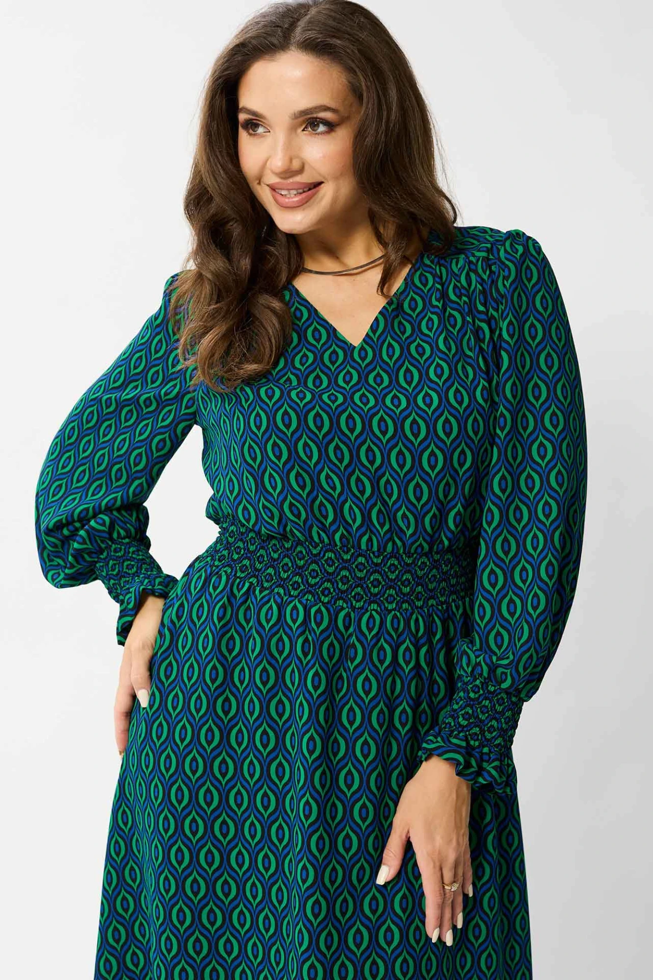 Платье женское полуприлегающего силуэта выполнено из ткани шифон . По переду кокетки, низ рукавов и по талии сборка на резинку «венгерку». Спинка на кокетке с небольшой сборкой. Рукава одно шовные втачные. Горловина v-образная. Платье на тонкой трикотажной подкладке.