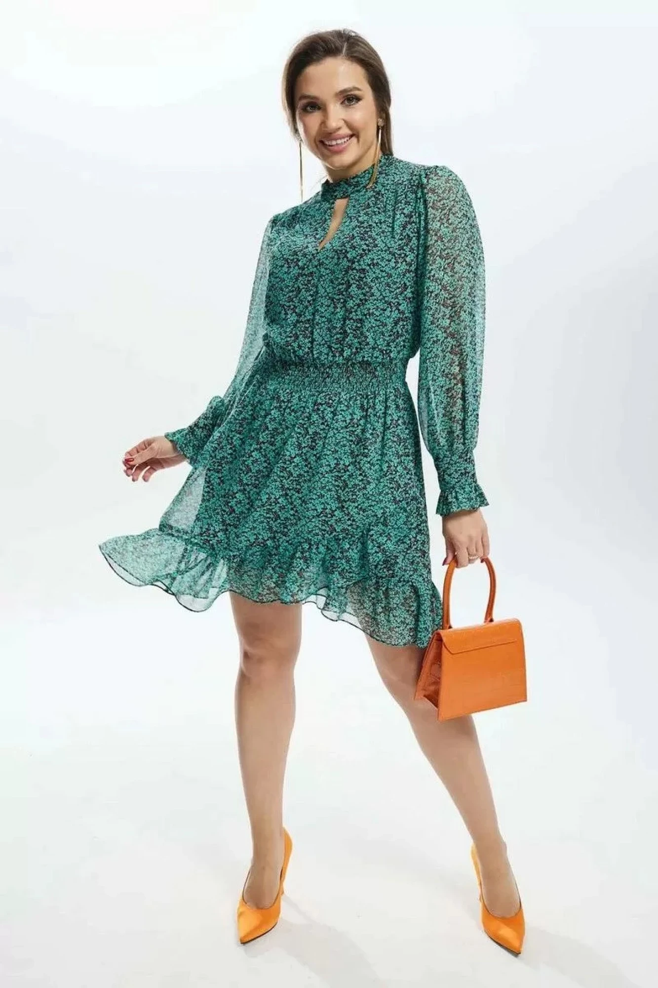 Платье женское свободного силуэта, отрезное по линии талии, расклешённое к низу, выполнено из ткани шифон. По линии талии сборка на резинку «венгерку». По переду кокетки с небольшой сборкой. Воротник стойка переходит в завязку по спинке. Рукава одно шовные втачные свободные, по низу манжет с втачной рюшей на застёжке на две прорезные петли и пуговицы. Низ платья на запах с воланом. Платье на тонкой трикотажной подкладке.