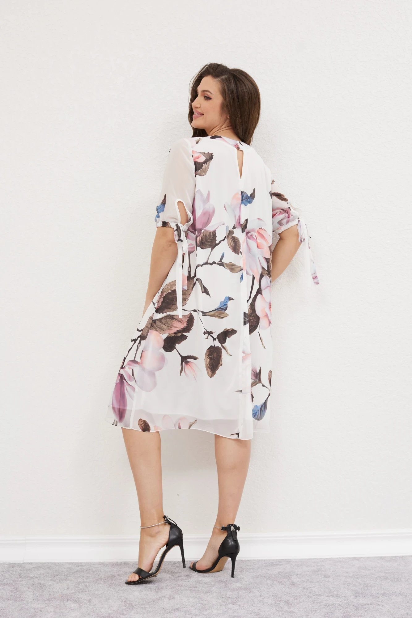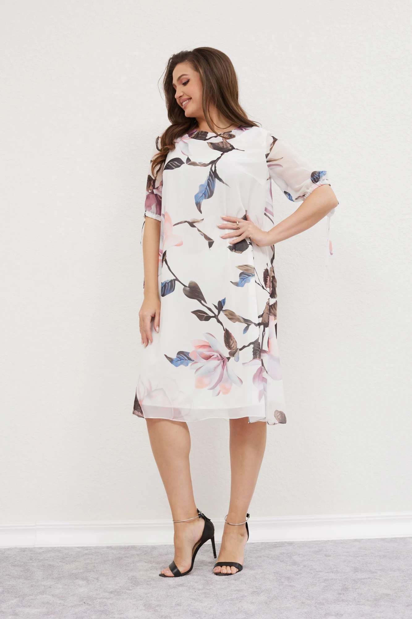 Платье женское А-силуэта, круглая горловина окантована и плавнопереходит в заявязку на спине. Спинка со средним швом, у горловины разрез. Рукав втачной , одношовный. Низ рукава на резинке и регулируется завязками. Платье на подкладке.
