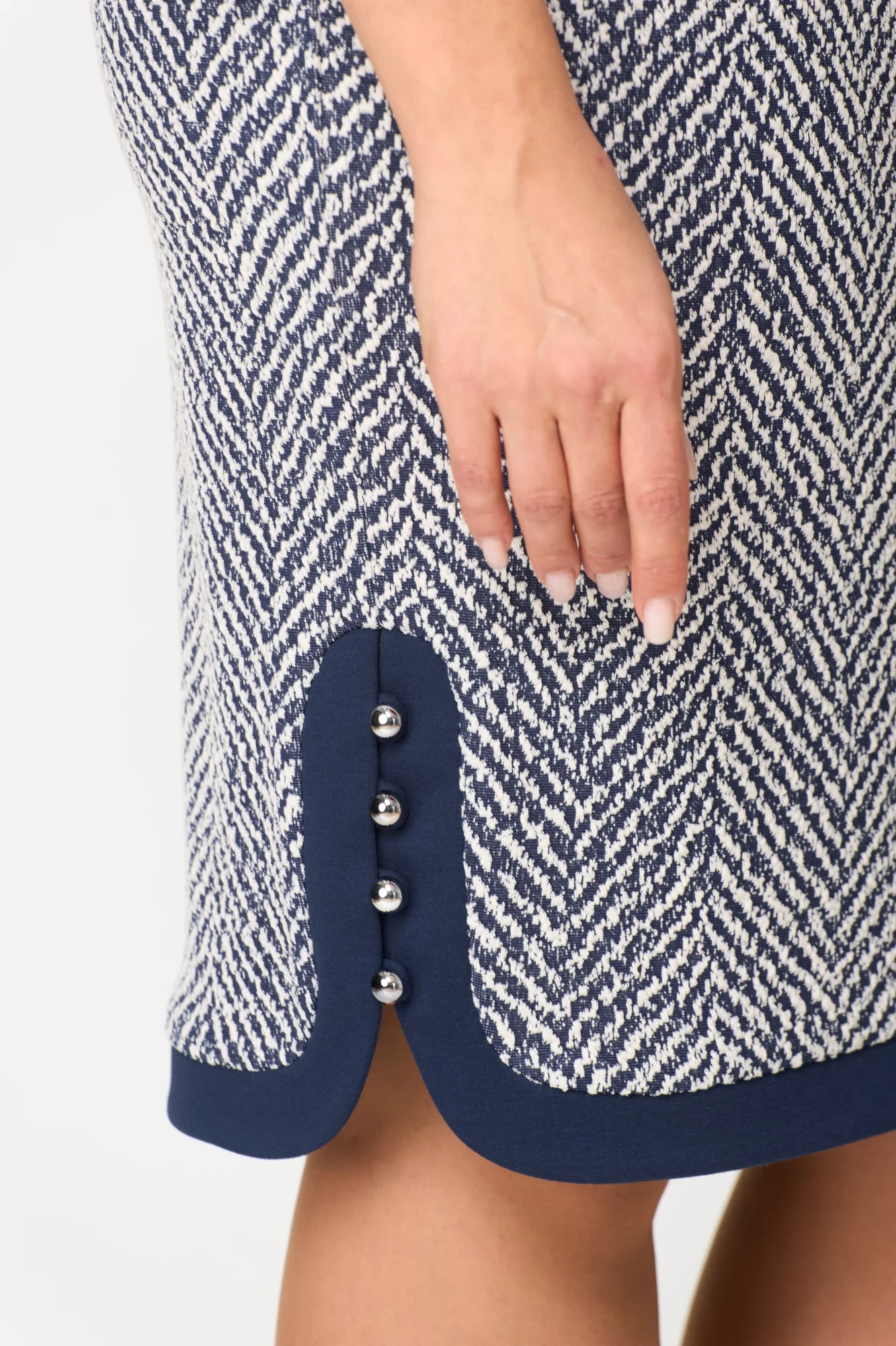 Трикотажное женское платье полуприлегающего силуэта, без подкладки, тесьма-молния в среднем шве спинки. Перед с нагрудными и талиевыми вытачками. Спинка с талиевыми вытачками, со средним швом. Рукав одношовный втачной. Горловина обработана бейкой и обтачкой. Низ переда, спинки, рукава обработан фигурной бейкой с закругленными концами, застегивается на навесные петли и пуговицы.