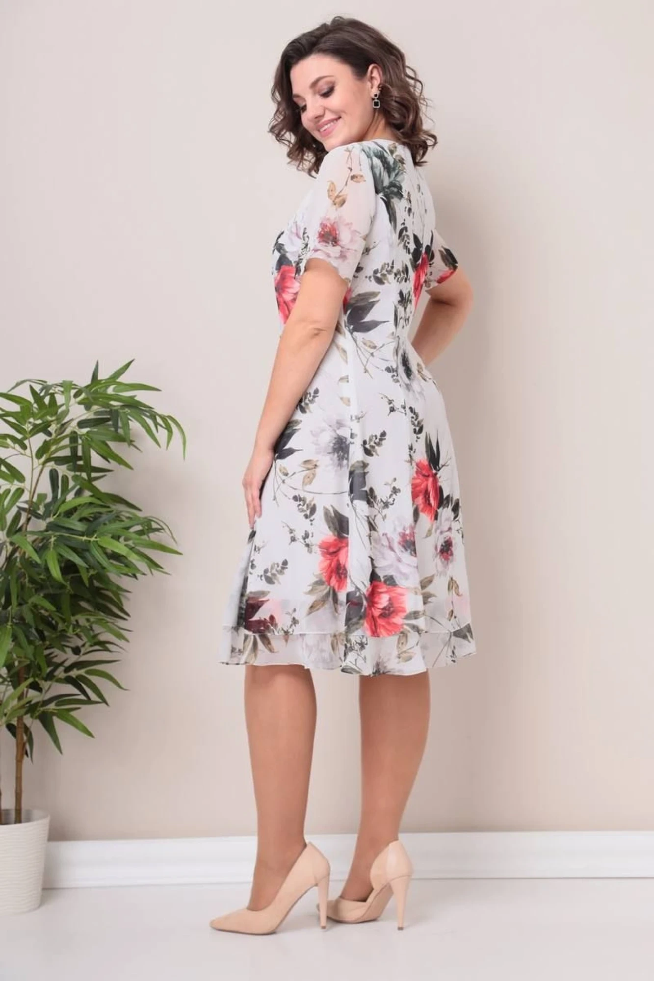 Платье женское А силуэта, на подкладке, тесьма-молния в левом боковом шве. Перед и спинка с рельефами от проймы. По низу платья волан, соединен по верхнему срезу с подкладкой. Рукав короткий, свободный, одношовный, втачной.