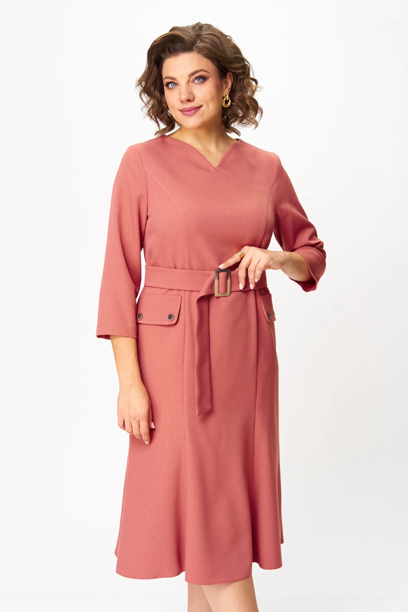 Платье женское полуприлегающего силуэта, расширенное к низу, без подкладки, тесьма-молния в среднем шве спинки. Перед и спинка с рельефами от проймы. Вырез горловины переда фигурный V-образный. На боковой части переда на уровне ниже линии талии, пришит закругленный клапан, закреплен по краям двумя пуговицами. Спинка со средним швом. Горловина обработана обтачками. Рукав втачной, одношовный. В дополнении пояс из основной ткани, фиксируется пряжкой.