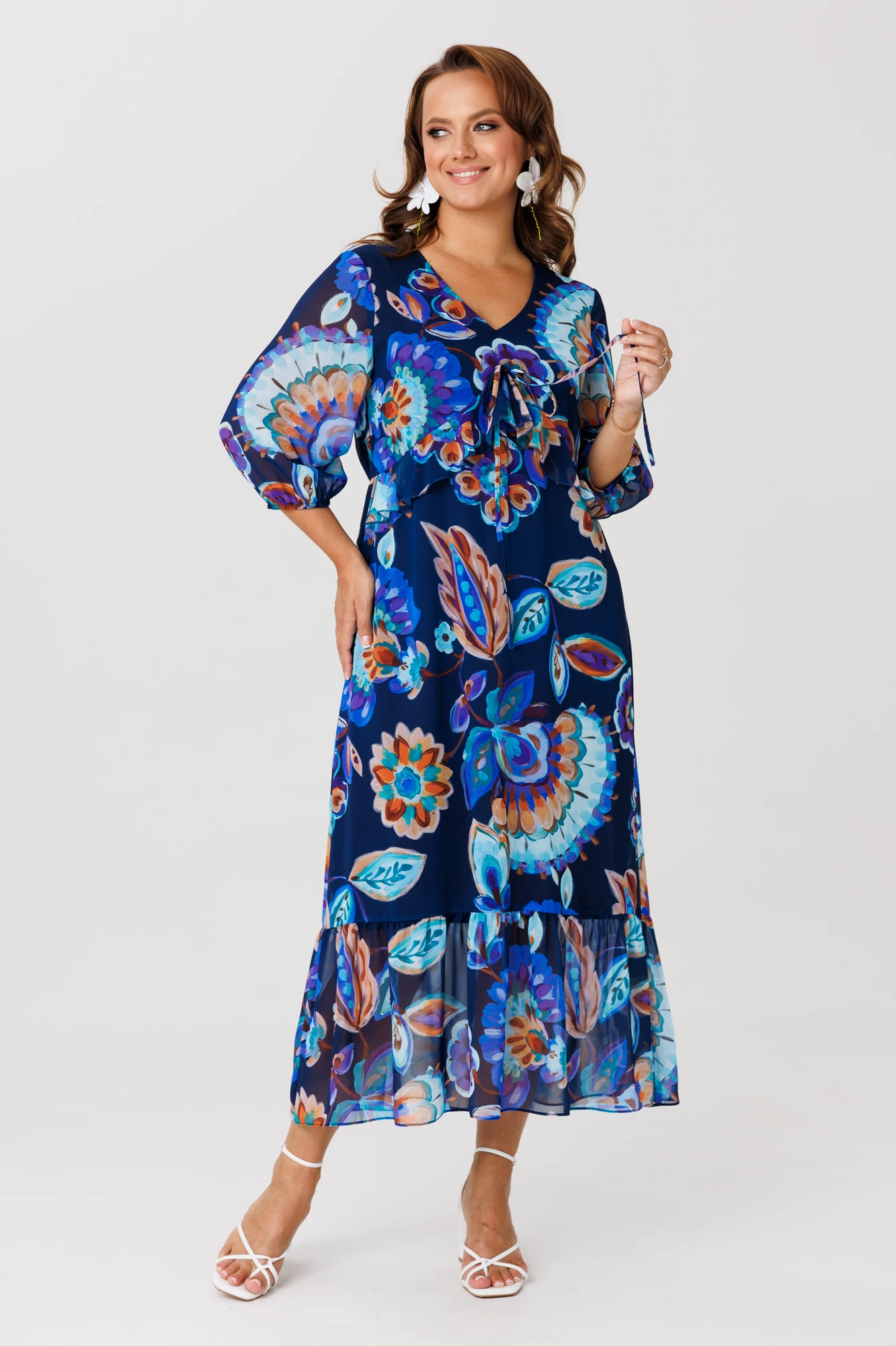 Нарядное женское платье изготовлено из плательной ткани шифон. На полочке горловина с V-образным вырезом, с фигурным подрезом под грудью. В подрез вставлен волан. Платье длинное, по низу притачной волан. Спинка отрезная по линии талии с эластичной резинкой. Платье на трикотажной подкладке. Рукав втачной, по низу рукава эластичная резинка.