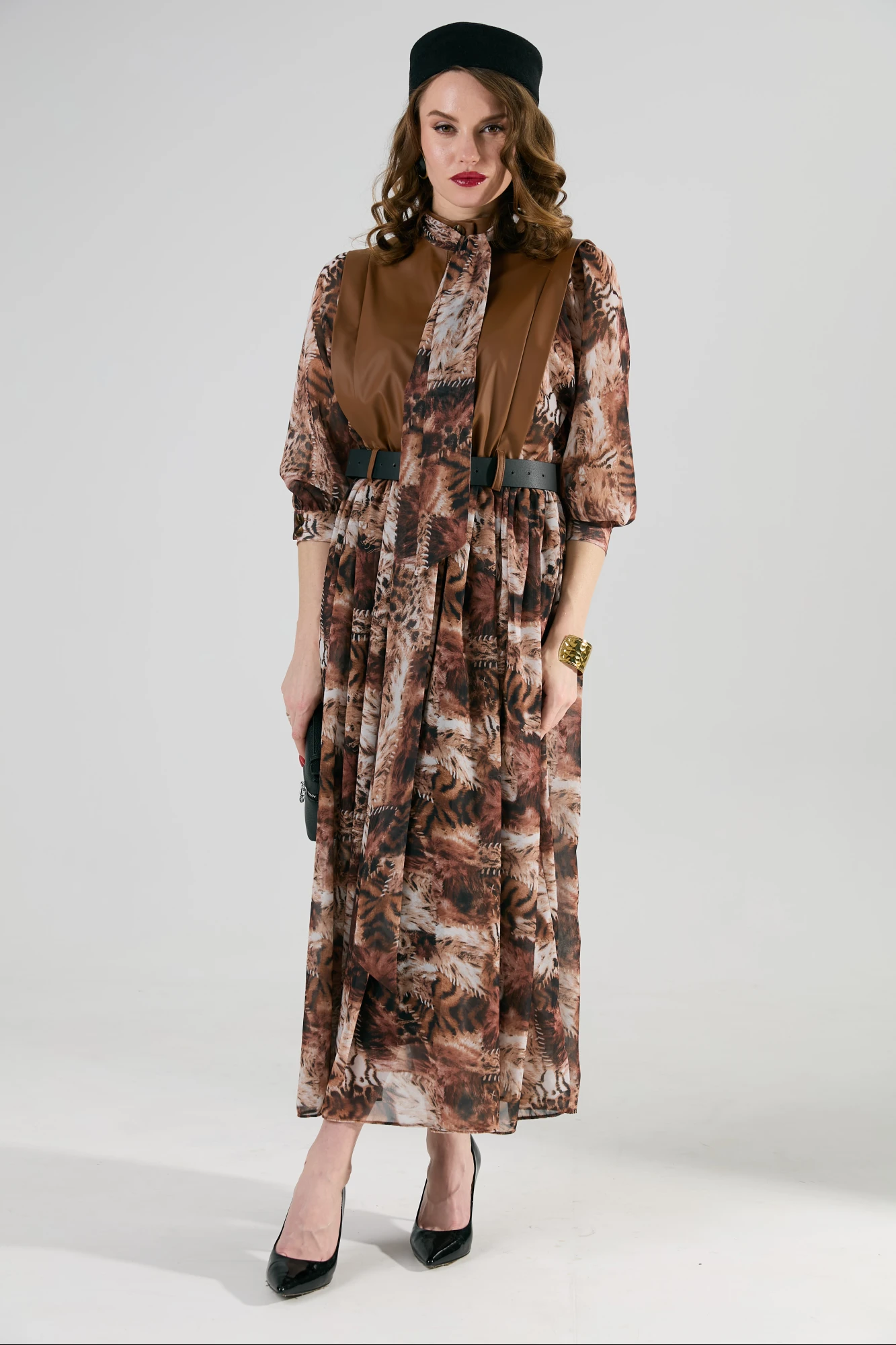Платье комбинированное длиной макси, отрезное по линии талии с цельнокроеными рукавами. Застежка центральная с цельнокроеными планками на петли и пуговицы. Верхние части переда и спинки с вертикальными рельефами, начинающимися от линии плеча. Бантовая складка расположена по центру, боковые складки направлены от центра изделия в сторону бокового шва. Рукав цельнокроеный с боковыми частями переда и спинки с углубленной до линии талии проймой. По центру оката рукава сборка. Нижний срез рукава обработан притачной манжетой. Застежка манжеты на петли и пуговицы. Платье по линии талии собрано на резинку. Горловина изделия круглой формы, обработана воротником-стойкой, с застежкой на петли и пуговицы. Платье дополнено съёмным бантом. Бант съёмный, продевается в шлевки, расположенные на воротнике-стойке. В комплект к изделию идёт ремень из экокожи.