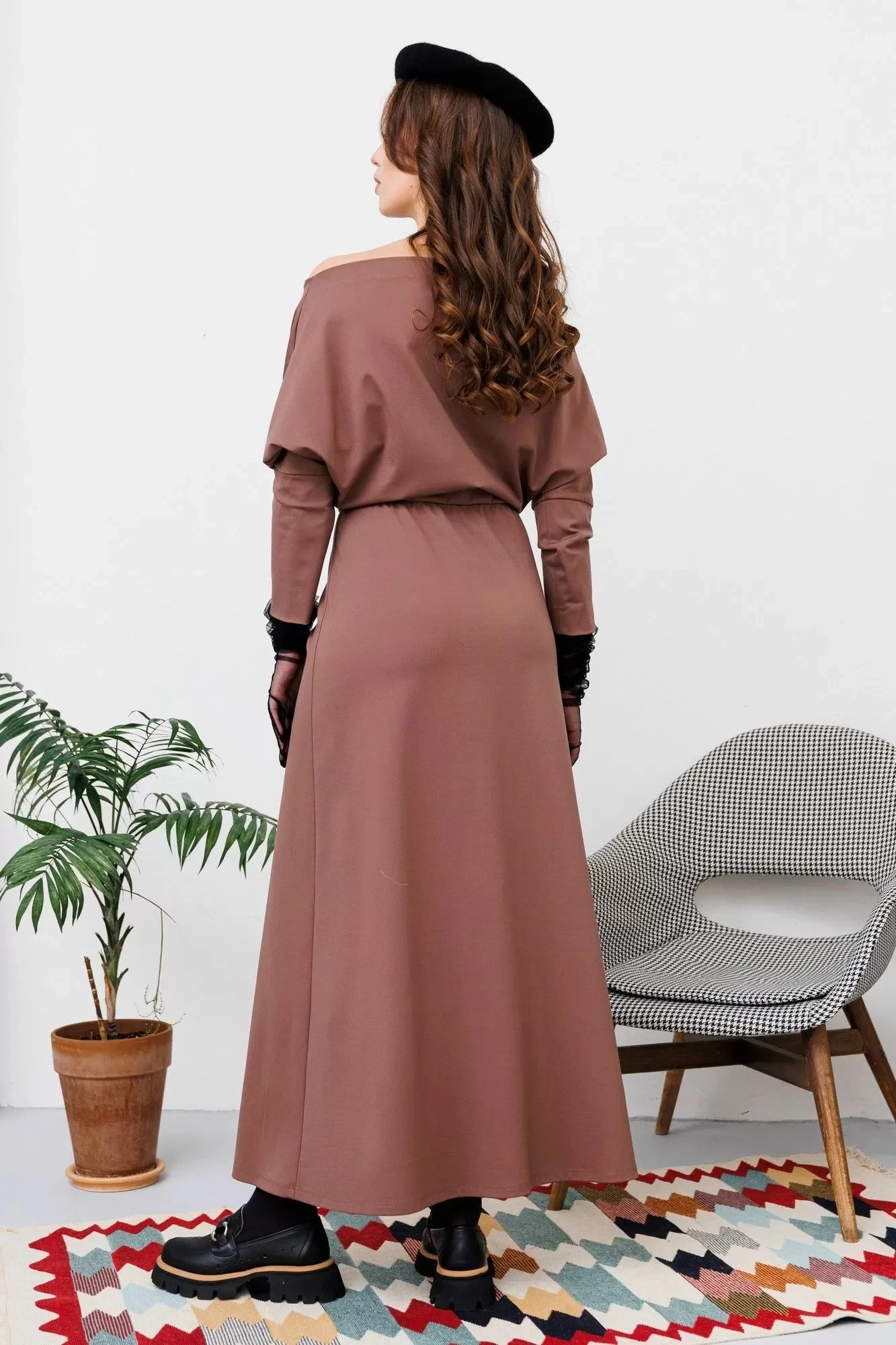 Элегантное трикотажное платье модели "летучая мышь" прилегающего силуэта отрезное по линии талии с цельнокроеным рукавом.Длина изделия в пол. Нижняя часть переда и спинки расширены к низу. Нижняя часть спинки с талиевыми вытачками. По линии талии платье собрано на легкую сборку резинкой. Нижний срез рукава со сборкой, обработан высокой притачной манжетой. Вырез горловины в форме «лодочка». Расширение выреза горловины по плечевым швам.